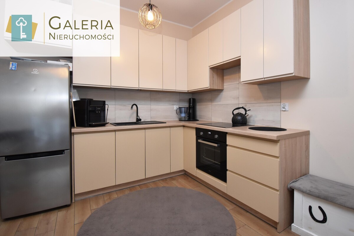 Kuchnia w neutralnej, ciepłej barwie jest wyposażona w zabudowę kuchenną oraz niezbędny sprzęt AGD.