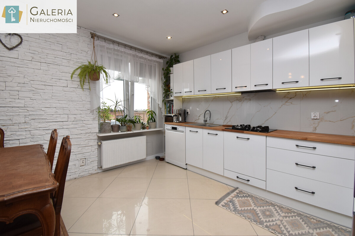 Wykonany w jasnej zabudowie w kształcie litery L, wyposażony w pełny zestaw sprzętów AGD. Zabudowa została zaprojektowana tak, aby zapewnić dużą funkcjonalność na co dzień. W kuchni znajduje się ogrzewanie podłogowe.