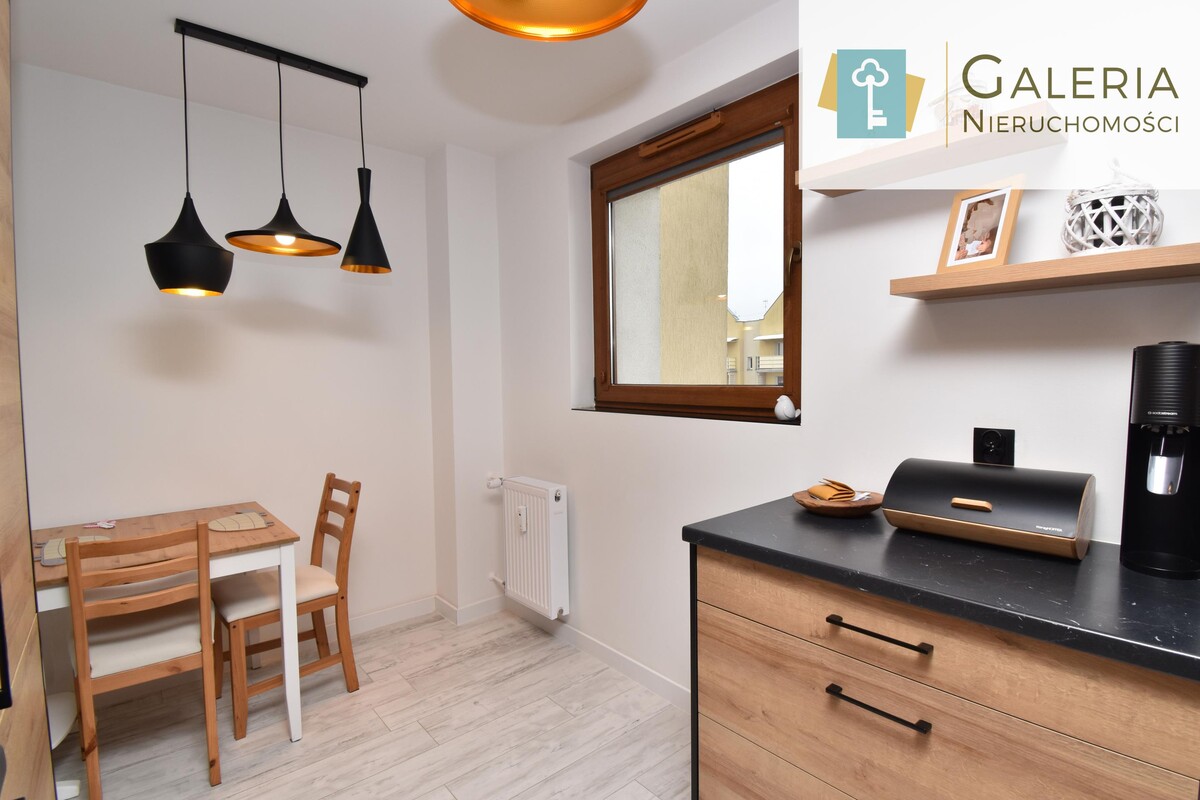 Salon bez problemu pomieści zarówno strefę wypoczynkową, jak i jadalnianą, a wyjście na balkon dodatkowo powiększa przestrzeń do relaksu. Oddzielna, nowoczesna kuchnia została wyposażona w niezbędny sprzęt AGD oraz miejsce do codziennych posiłków. Łazienka oferuje prysznic oraz praktyczne szafki do przechowywania.