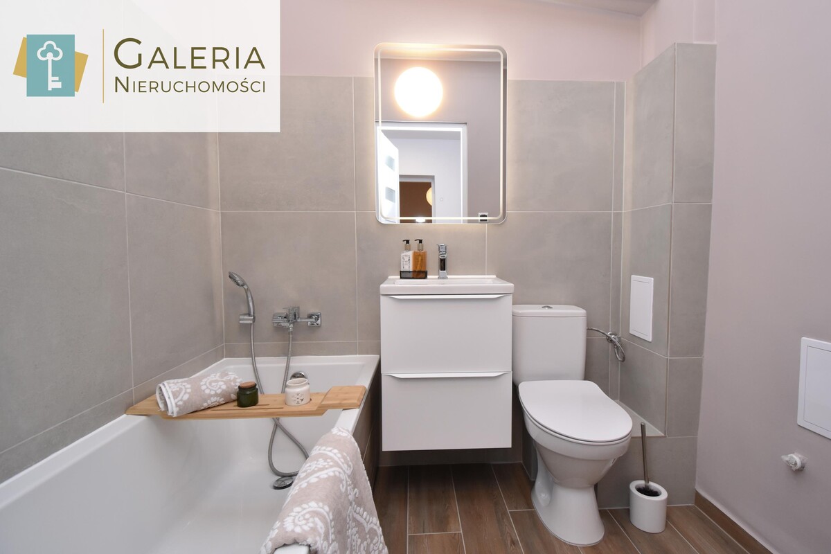 - nowoczesna łazienka z wanną i WC,