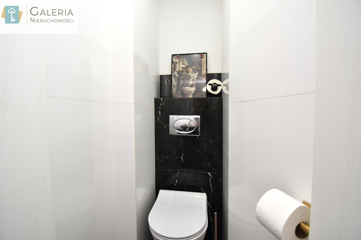 Łazienka została urządzona w nowoczesnym stylu z prysznicem i jasnym wykończeniem, co zapewnia estetykę oraz łatwość utrzymania czystości. Dodatkowe, oddzielne WC zwiększa komfort i prywatność domowników.