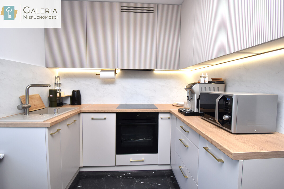 Oddzielna kuchnia wyposażona jest w nowoczesną zabudowę w modnej kolorystyce, która doskonale komponuje się z wystrojem wnętrza.