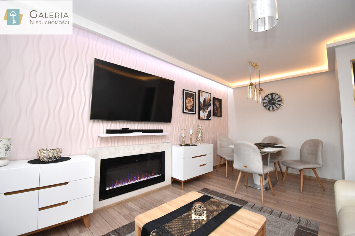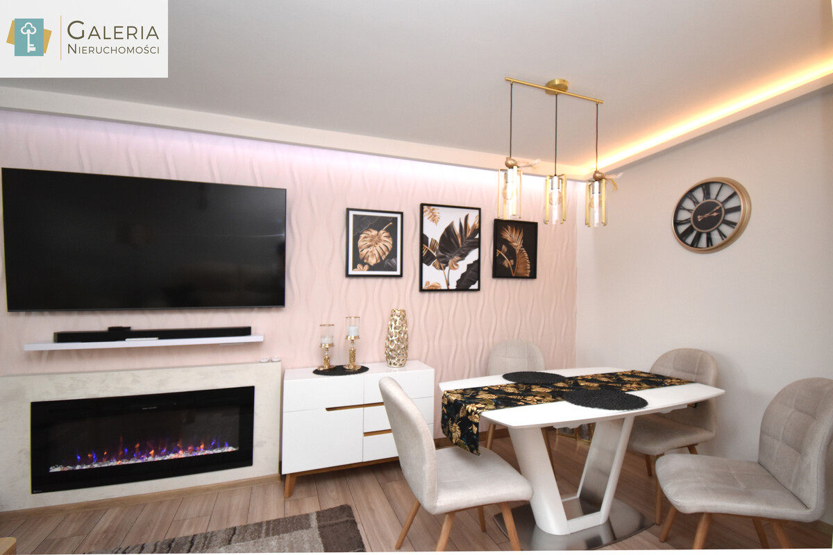 - Salon z wyjściem na balkon - jasna, słoneczna przestrzeń idealna do wypoczynku i spotkań. W salonie znajduje się elegancki kominek elektryczny z funkcją grzania, nowoczesne oświetlenie sufitowe oraz podwieszany sufit z oświetleniem LED sterowanym pilotem. Wszystkie meble widoczne na zdjęciach w cenie: nowoczesny stół z krzesłami, wygodna kanapa oraz komfortowy fotel z regulowanymi podnóżkami bardzo eleganckie i idealne do relaksu, czytania czy popołudniowej drzemki.