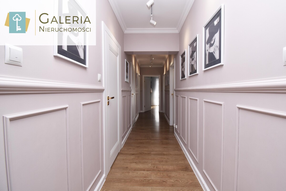 Reprezentacyjna przestrzeń wejściowa z nowoczesną zabudową, dużym lustrem oraz eleganckimi, złotymi wykończeniami. Pojemna szafa w zabudowie zapewnia wygodę przechowywania.