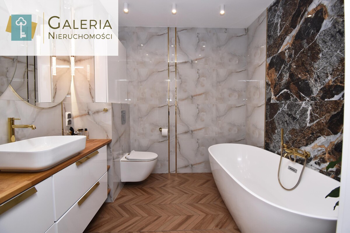 Pierwsza łazienka: Nowoczesna i elegancka, wyposażona w wolnostojącą wannę ze złotą armaturą. Podświetlane lustra LED oraz praktyczna zabudowa. Ogrzewanie podłogowe.