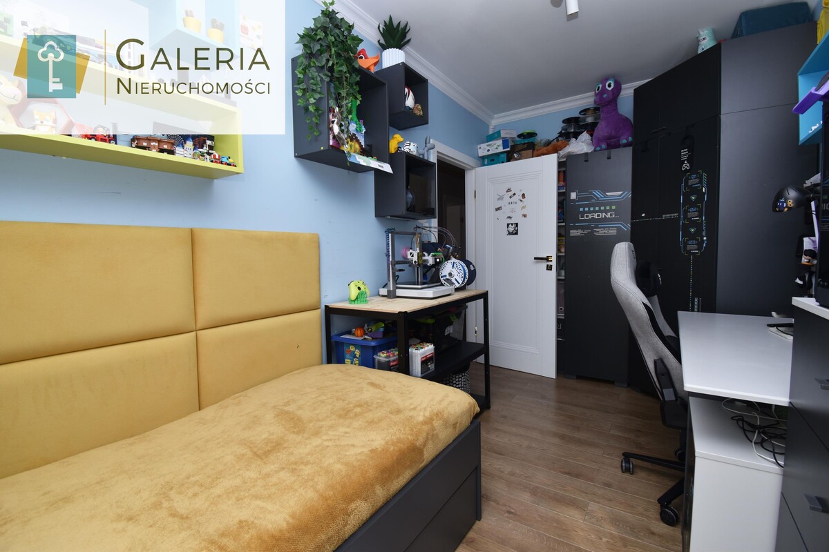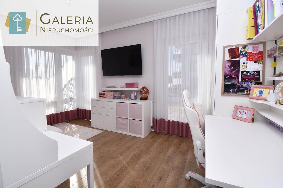 Funkcjonalna przestrzeń z zabudową na wymiar, liczne półki, szafki i miejsce na przechowywanie. Może pełnić również funkcję dodatkowego pokoju, np. dziecięcego.