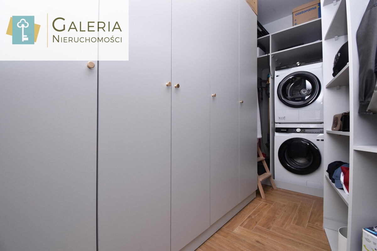 Funkcjonalne pomieszczenie z zabudową na wymiar liczne półki, szafy oraz miejsce na pralkę i suszarkę pozwalają na wygodne przechowywanie i organizację przestrzeni.