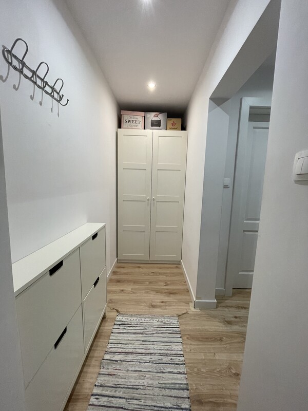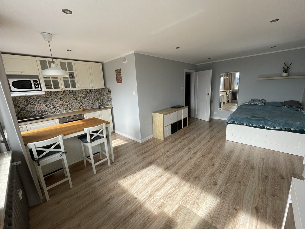 Pokój połączony z aneksem kuchennym, przedpokój, łazienka i balkon. Funkcjonalnie urządzona, wygodna, z wyposażeniem. Sprzęt AGD: pralka, zmywarka, płyta grzewcza, mikrofalówka, lodówka, odkurzacz. Łóżko 200x140cm z wysokiej jakości materacem sprężynowym. W przedpokoju szafa, w pokoju miejsce do pracy przy biurku.