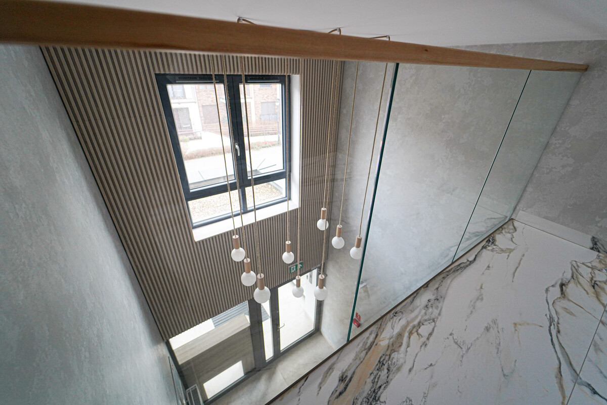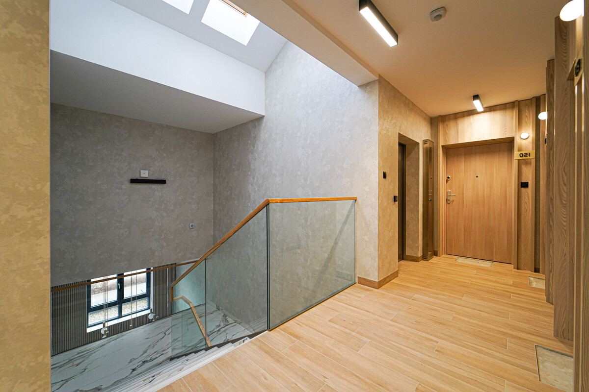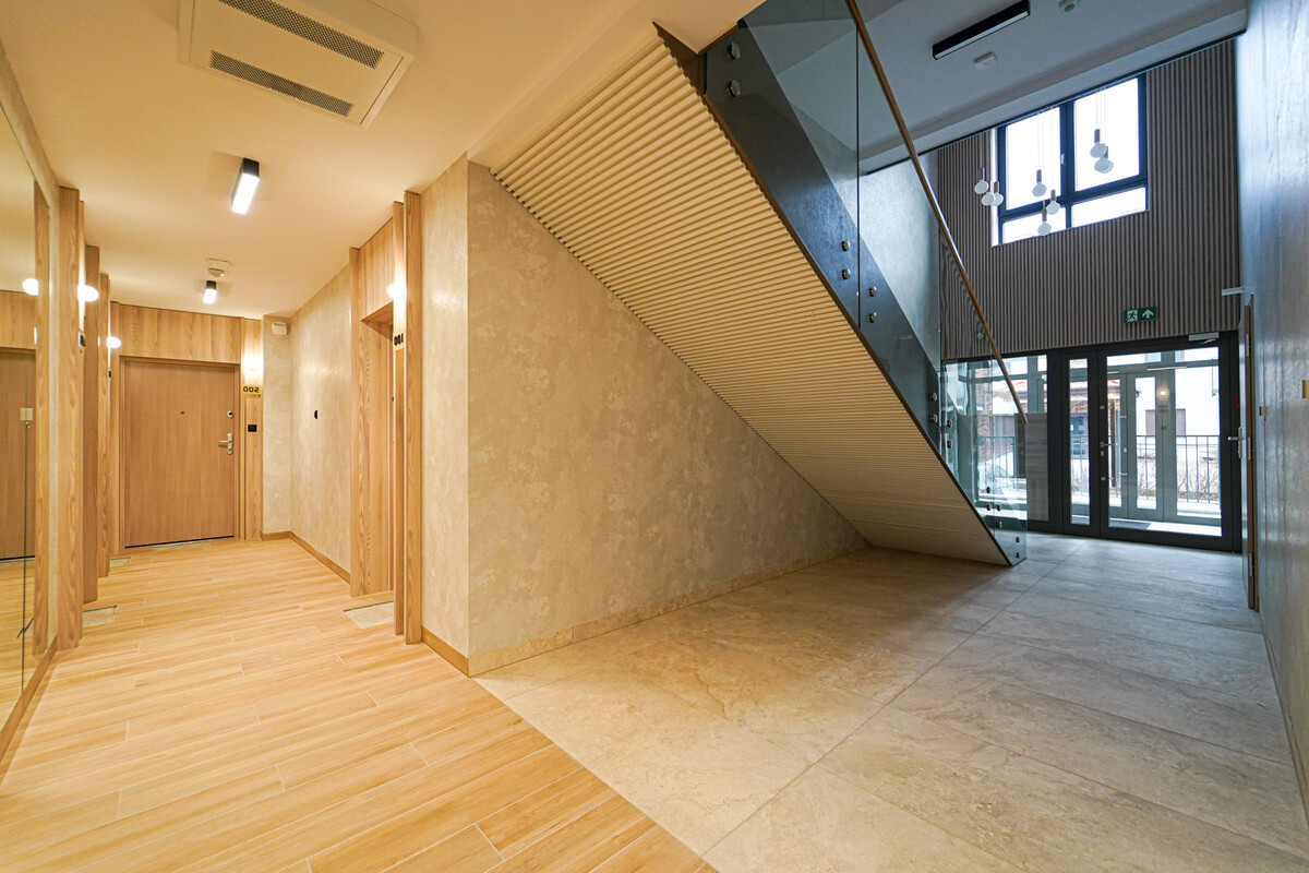Budynek, w którym mieści się apartament, charakteryzuje się nowoczesnym stylem, a klatka schodowa została zaprojektowana z dbałością o estetykę i odpowiednie doświetlenie. Dodatkowo, znajduje się tu cichobieżna winda, zapewniająca komfort użytkowania.