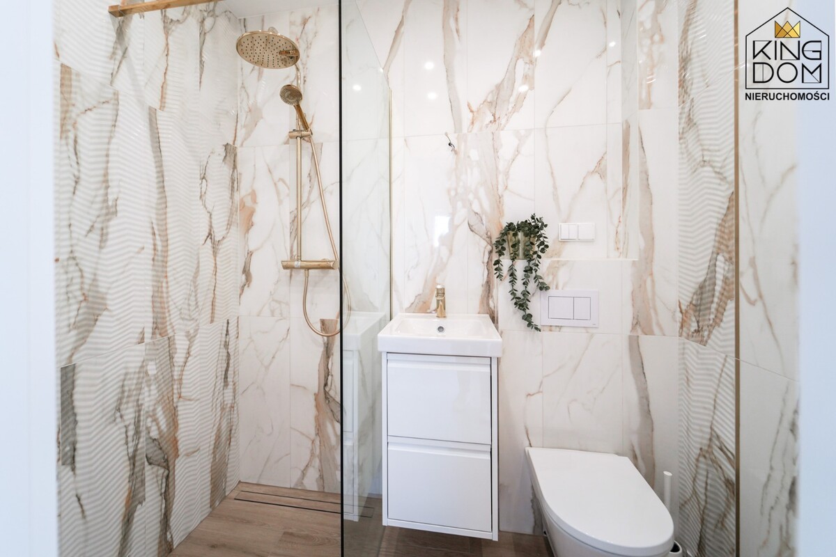 - nowoczesna łazienka z kabiną prysznicową i wc,