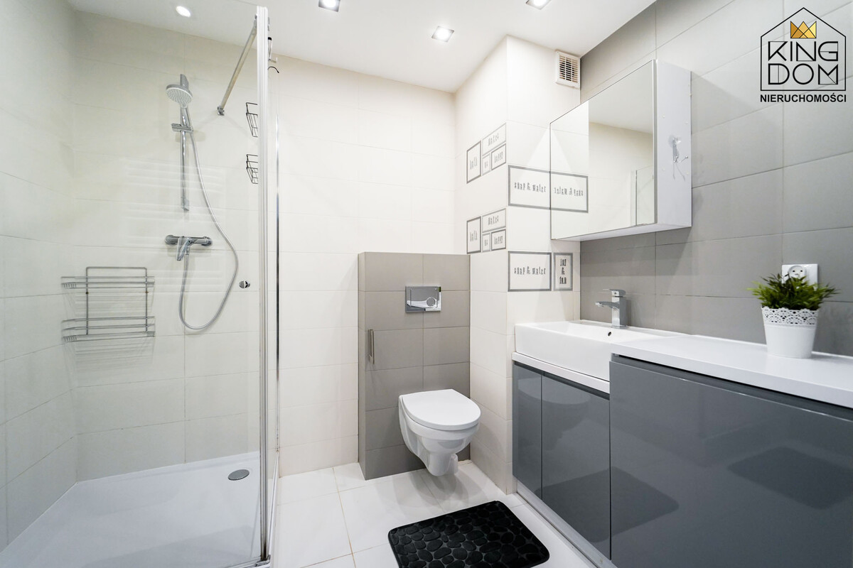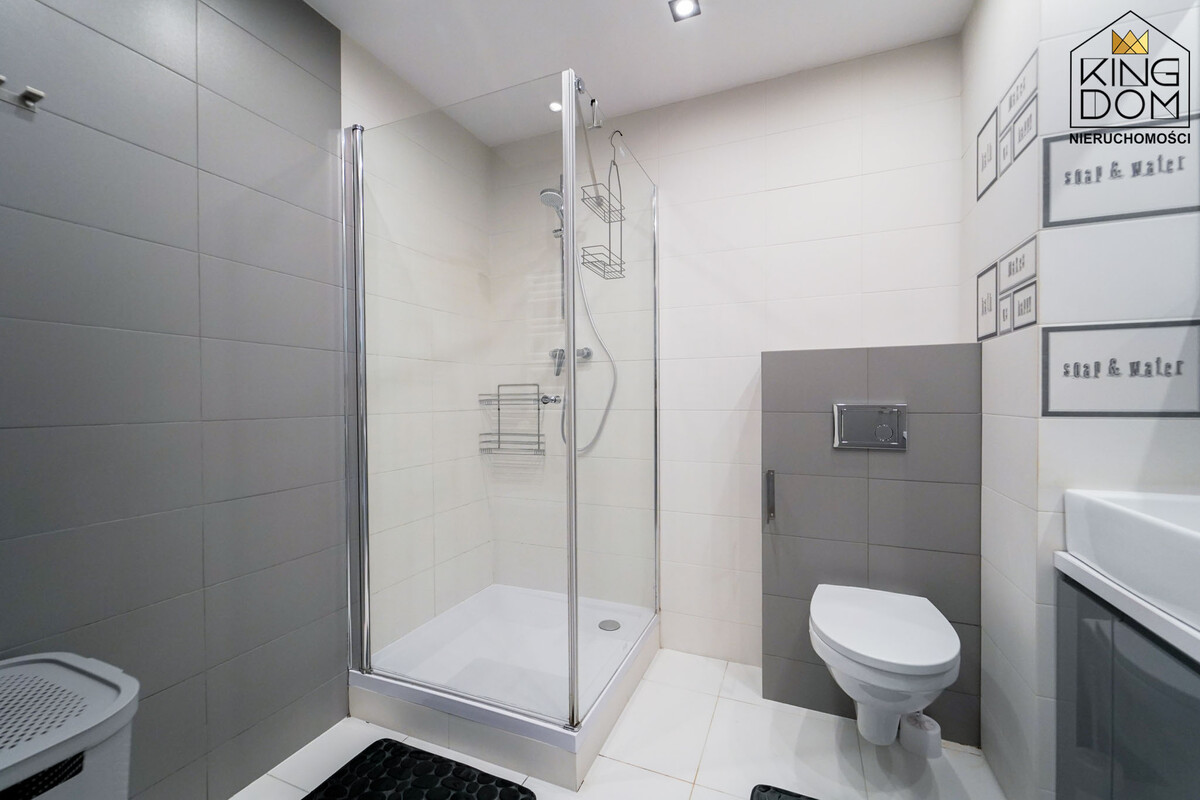- nowocześnie urządzona łazienka z kabiną prysznicową, wc oraz pralką,