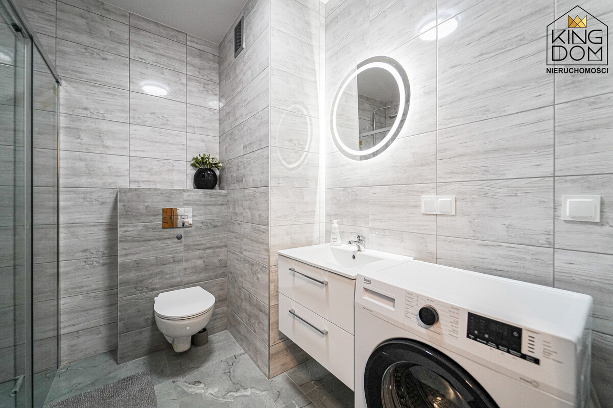 - komfortowa łazienka z kabiną prysznicową, wc oraz pralką,