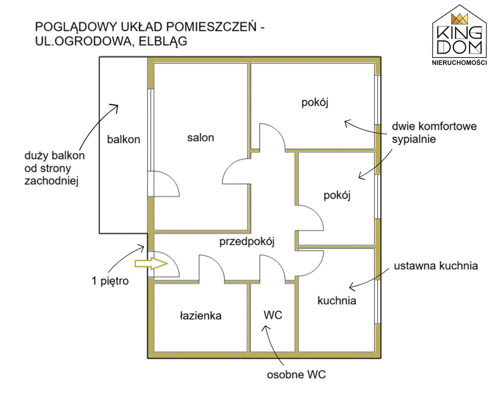 KINGDOM Nieruchomości prezentuje na sprzedać przestronne 3-pokojowe mieszkanie z bardzo dużym balkonem, usytuowane na pierwszym piętrze w cichej i spokojnej lokalizacji. Nieruchomość idealna dla rodziny, pary lub osób ceniących dużą przestrzeń w spokojnej, a jednocześnie dobrze skomunikowanej części miasta.