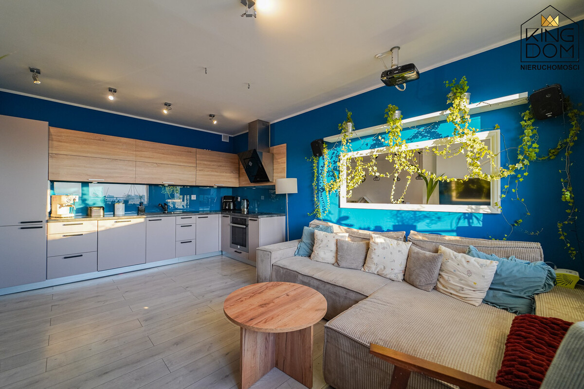 - jasny, przestronny salon wraz z aneksem kuchennym w zabudowie ze sprzętami AGD, oraz wyjściem na duży balkon,