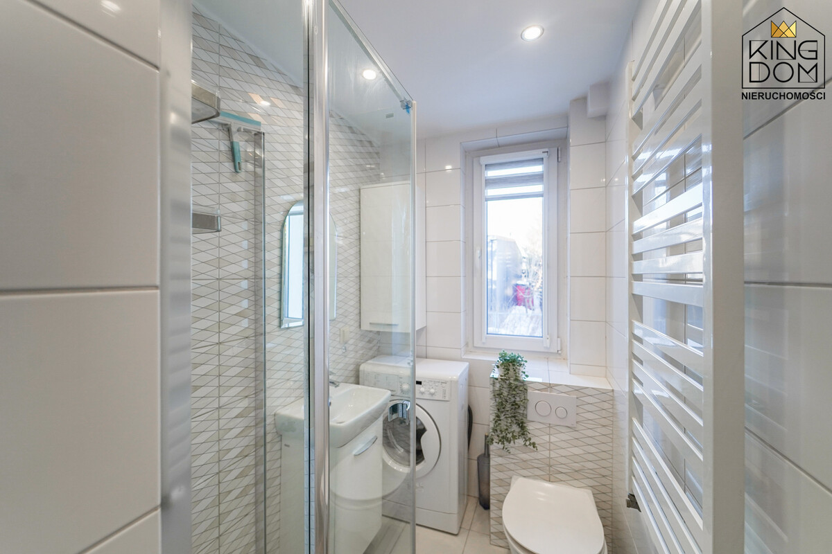 - łazienka z kabiną prysznicową, wc i pralką,