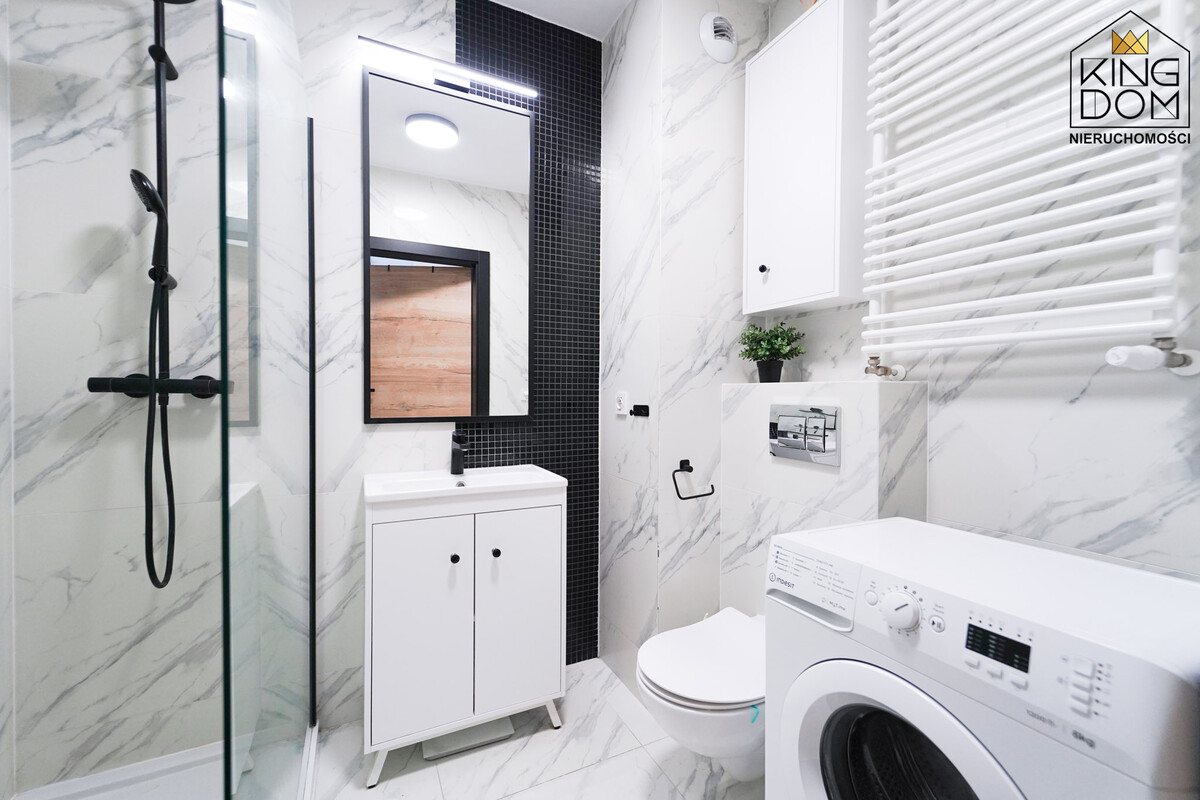 - nowoczesna łazienka z kabiną prysznicową i wc,