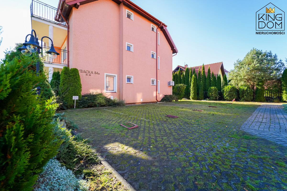 Teren wokół budynku ogrodzony, zabezpieczony bramą na pilota i starannie zagospodarowany.