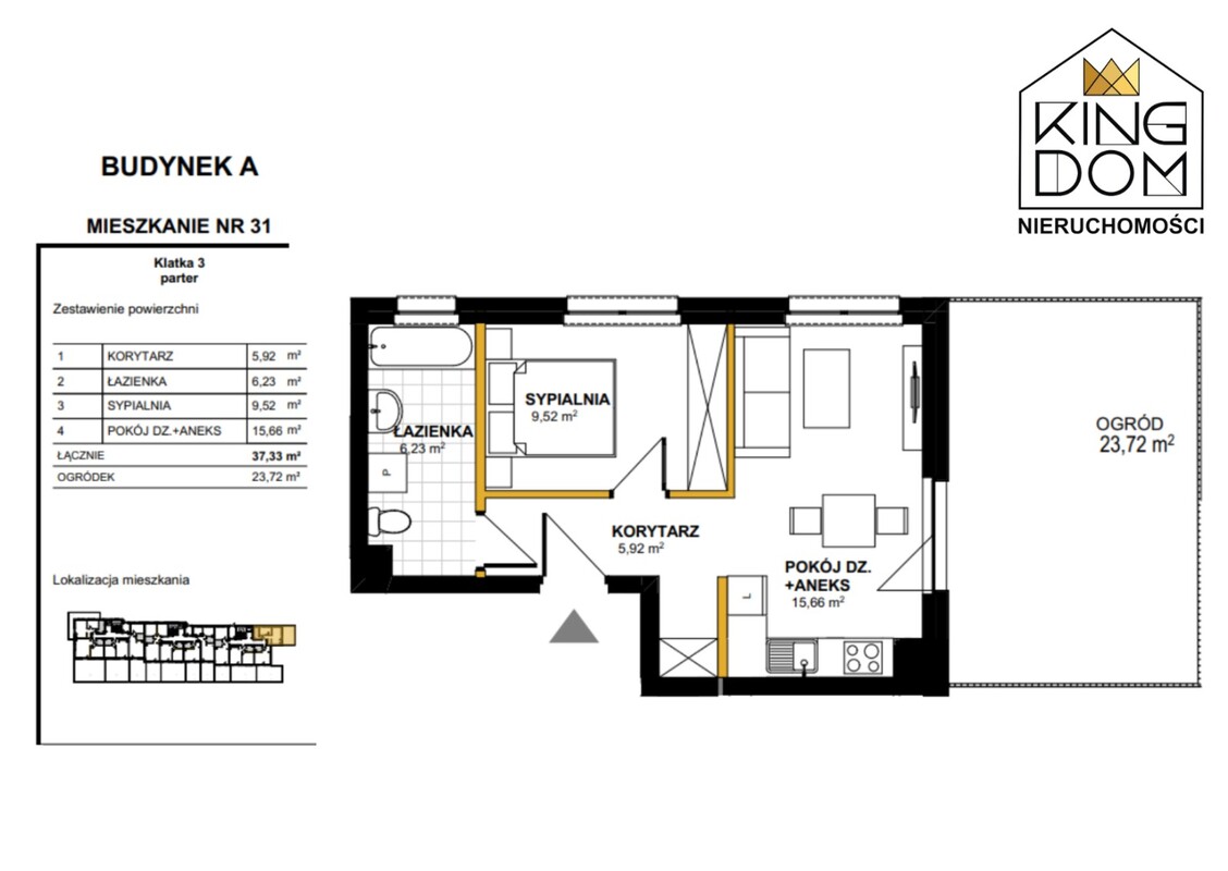 - salonu z wydzielonym miejscem pod aneks kuchenny o powierzchni 15,66 m2 oraz wyjściem na taras z dużym ogródkiem o powierzchni 23,72 m2,