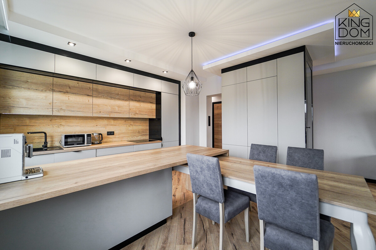 - nowoczesna kuchnia w zabudowie ze sprzętami AGD (lodówka, płyta indukcyjna, piekarnik, okap zmywarka) z półwyspem oraz wydzieloną częścią jadalnianą,