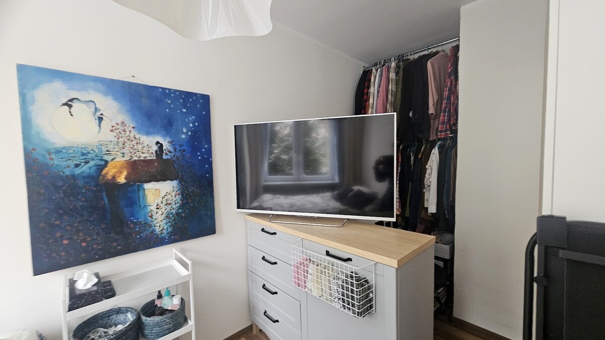 Lokal składa się z salonu z balkonem z widokiem na park, dwóch zamykanych niezależnych sypialni, kuchni, łazienki z wc i przedpokoju.