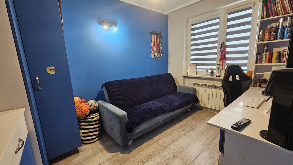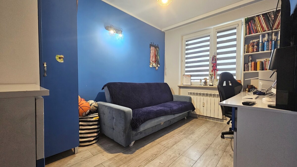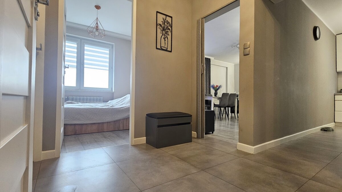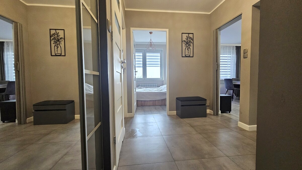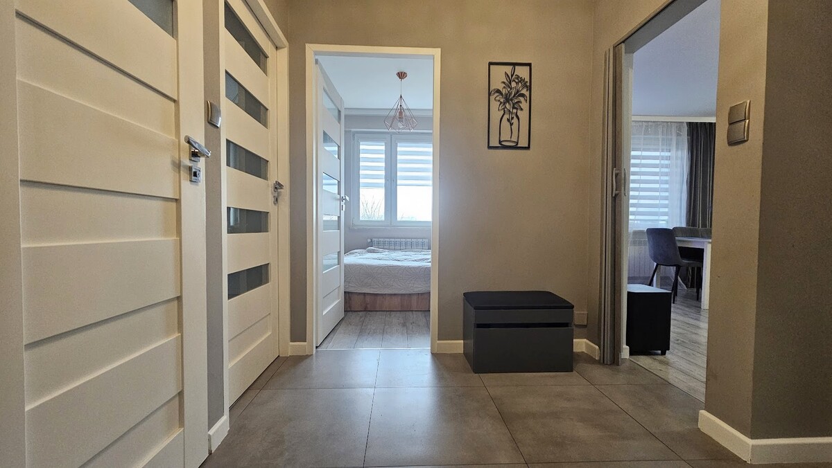 Lokal składa się z salonu z balkonem, dwóch odrębnych sypialni, kuchni, łazienki z wc i przedpokoju.