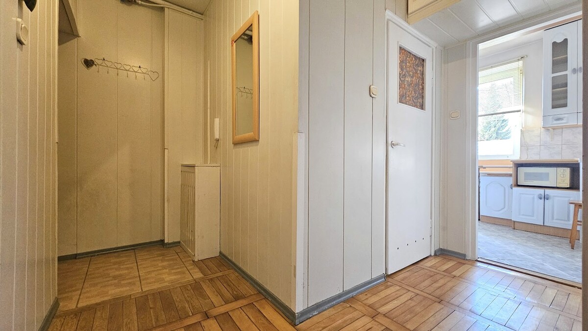 Lokal składa się z przestronnego pokoju z wnęką, gdzie można zrobić aneks kuchenny, a w kuchni gdzie znajduje się duże okno- można zrobić sypialnię.