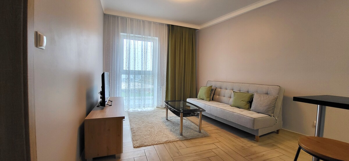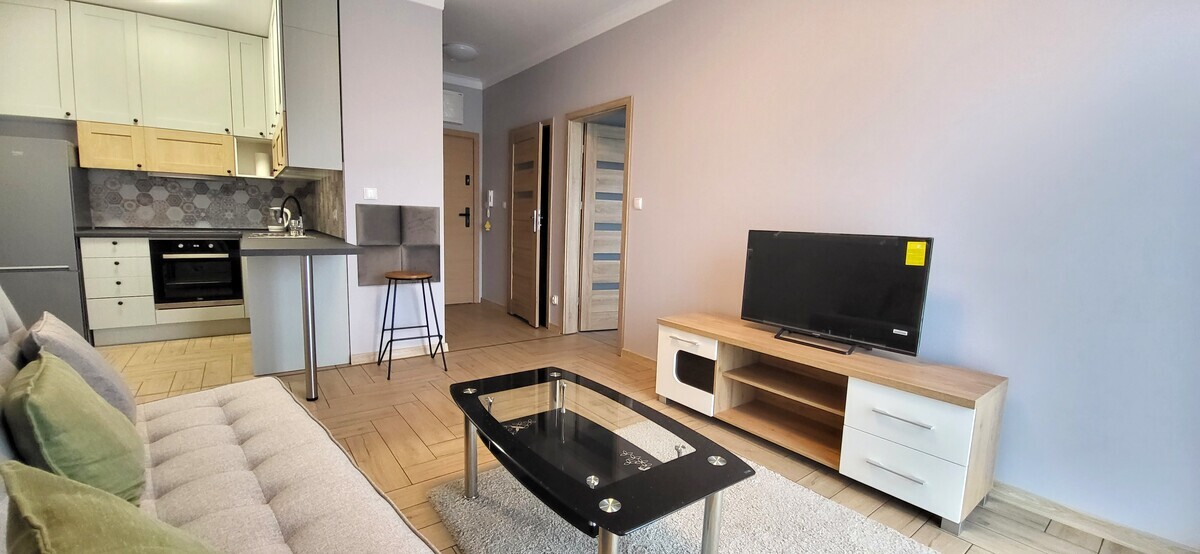 Mieszkanie o powierzchni 37,42 m2 składa się z salonu z aneksem kuchennym, sypialni, łazienki z wc i przedpokoju. Jest kompletnie umeblowane i wyposażone. Kuchnia w zabudowie ze sprzętem AGD, w przedpokoju funkcjonalna szafa, w łazience pralka, w sypialni kanapa i szafa, w salonie kanapa, szafka rtv z telewizorem i stolik.