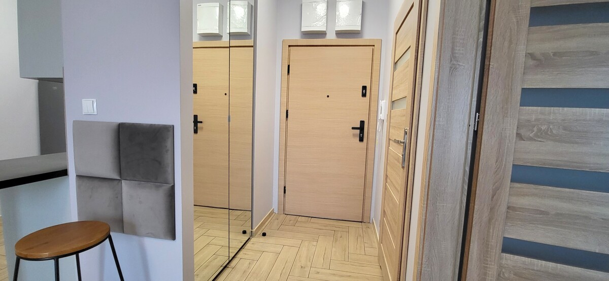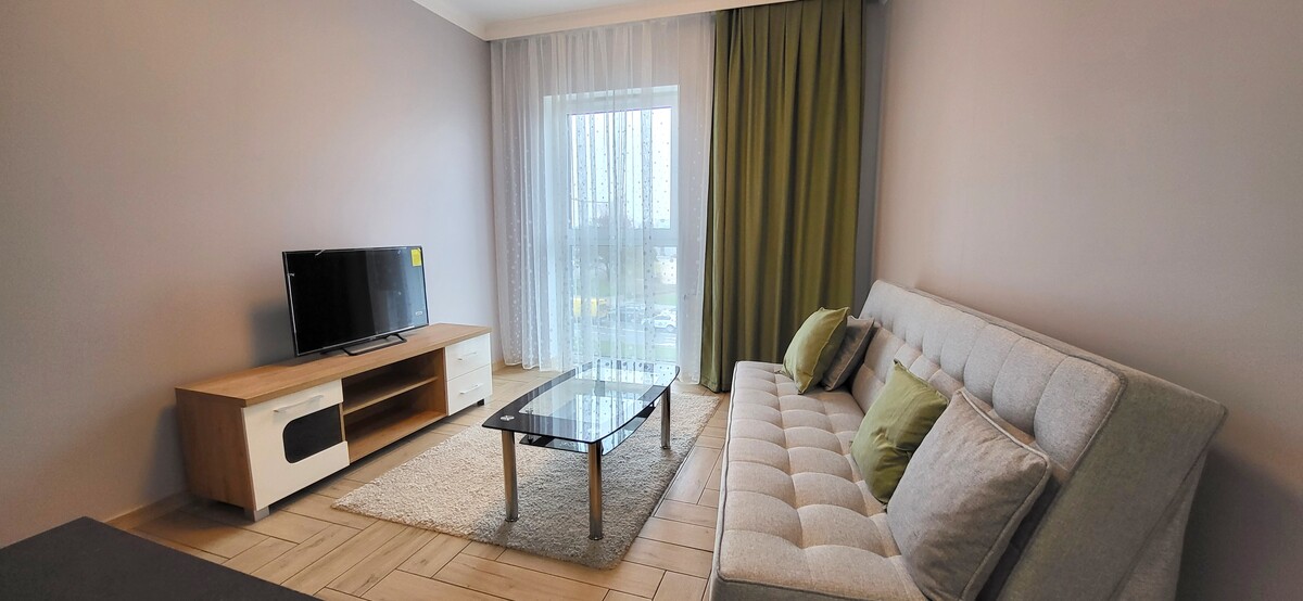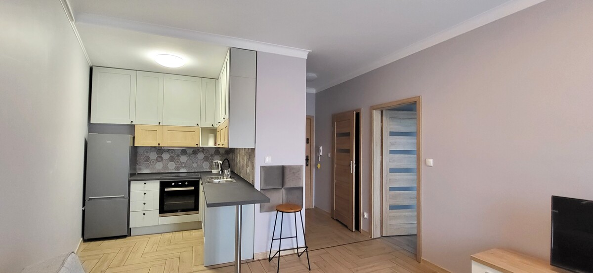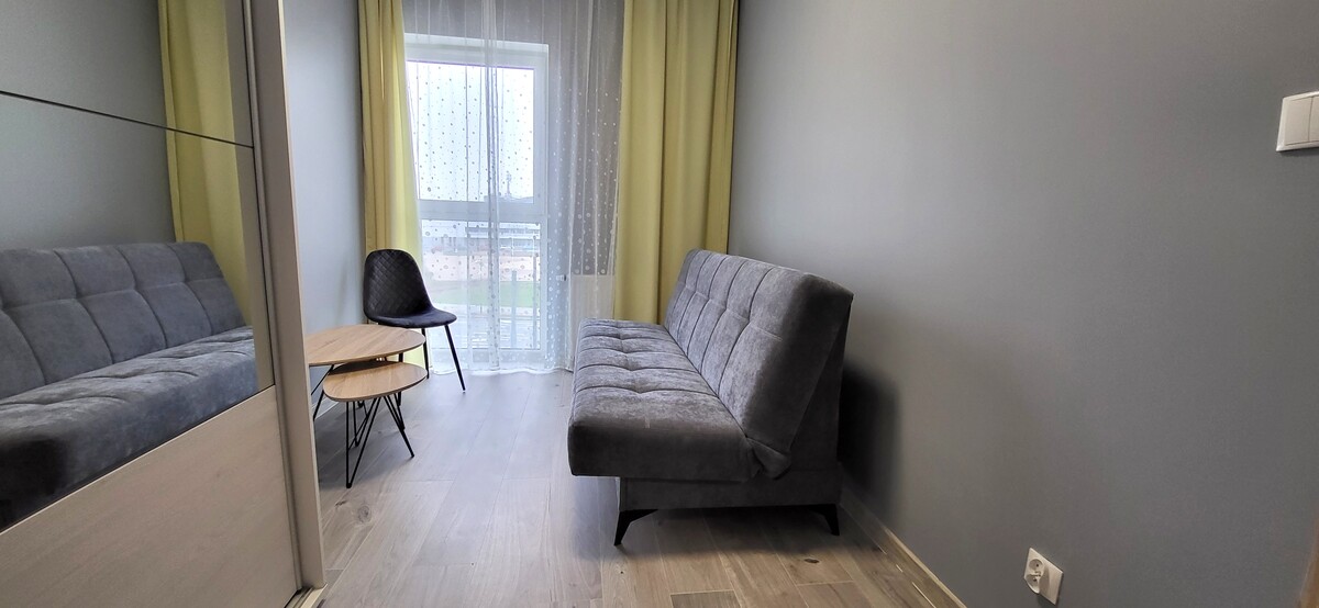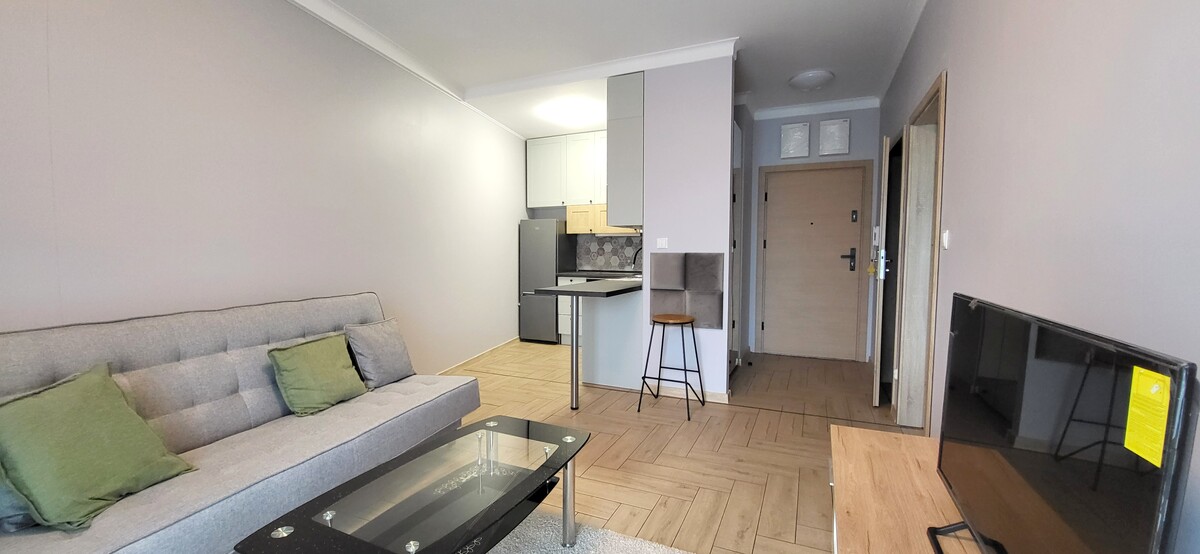 Mieszkanie o powierzchni 37,42 m2 składa się z salonu z aneksem kuchennym, sypialni, łazienki z wc i przedpokoju. Jest kompletnie umeblowane i wyposażone. Kuchnia w zabudowie ze sprzętem AGD, w przedpokoju funkcjonalna szafa, w łazience pralka, w sypialni kanapa i szafa, w salonie kanapa, szafka rtv z telewizorem i stolik.