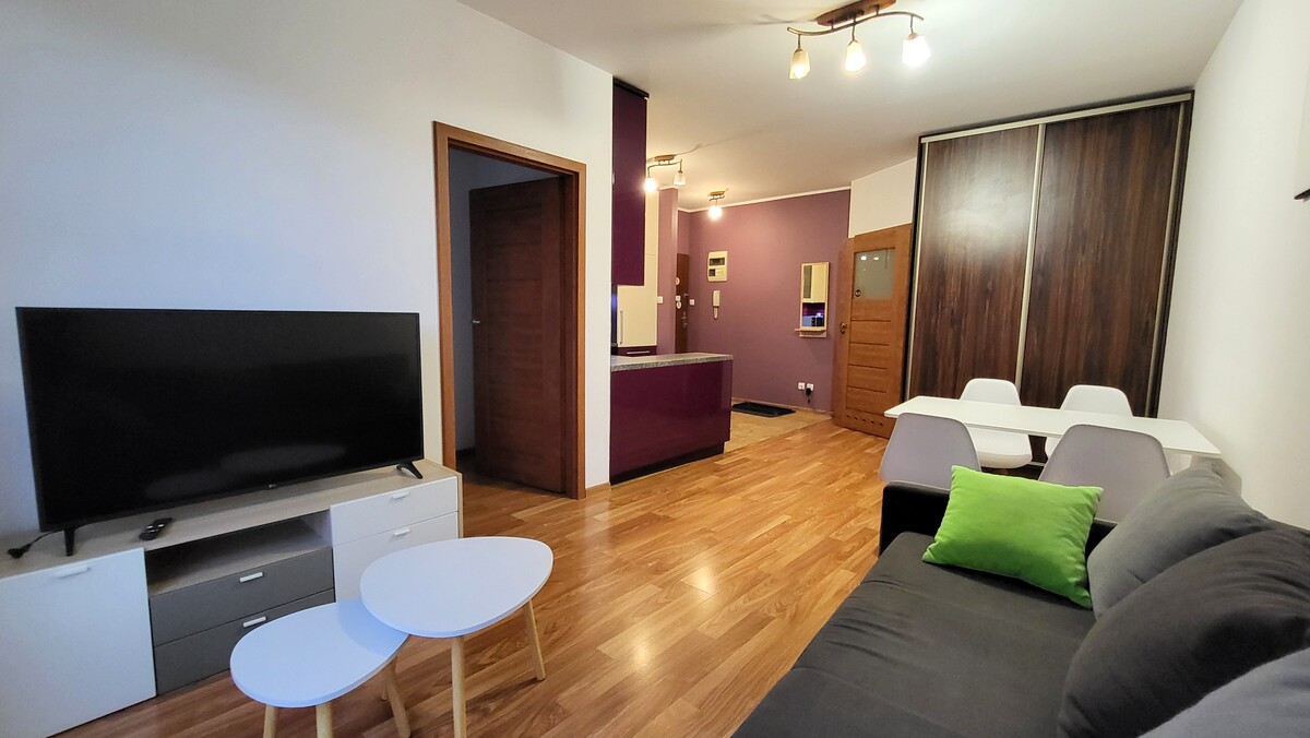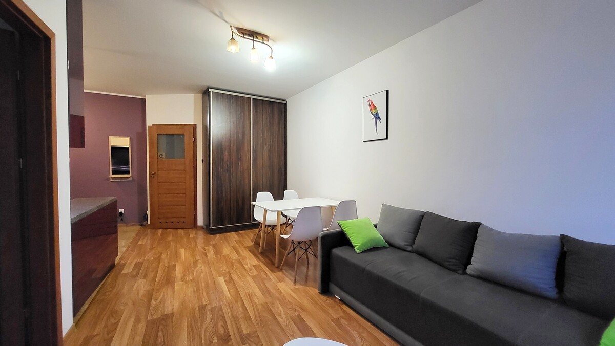 Mieszkanie jest umeblowane i wyposażone. Aneks kuchenny w zabudowie ze sprzętem AGD (lodówka, płyta grzewcza, piekarnik), w salonie kanapa, stół z krzesłami, szafa w zabudowie, w sypialni łóżko.