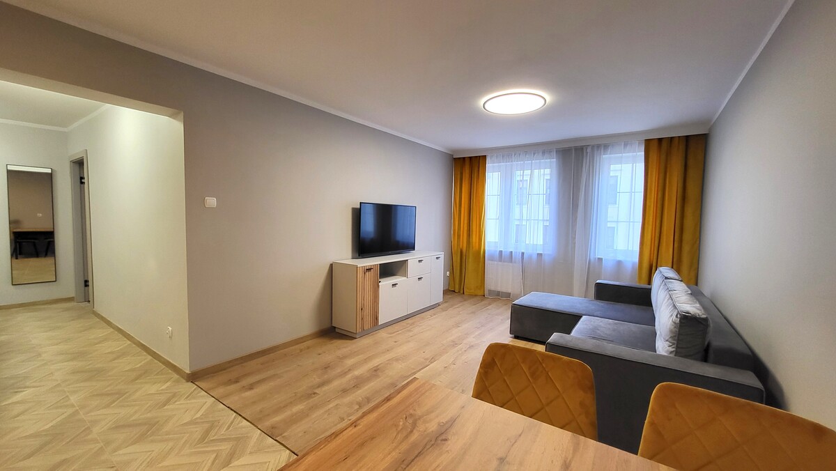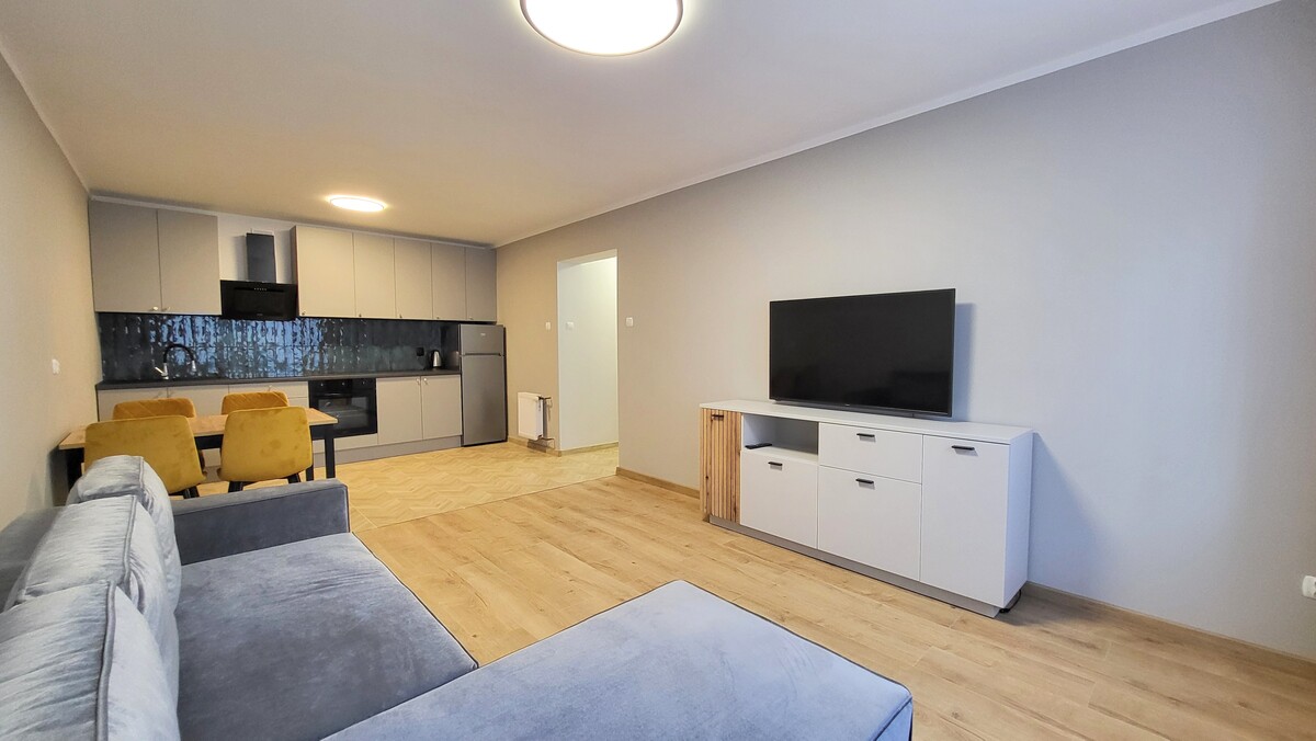 Mieszkanie jest po generalnym remoncie. Na powierzchnię 52,55 m2 składa się salon z aneksem kuchennym, sypialnia, łazienka z wc i przedpokój. Jest kompletnie umeblowane i wyposażone. Kuchnia w zabudowie ze sprzętem AGD, w łazience pralka, w sypialni kanapa, komoda i szafa, w salonie kanapa, szafka rtv z telewizorem oraz stół i krzesła. Wszystkie media z miasta.