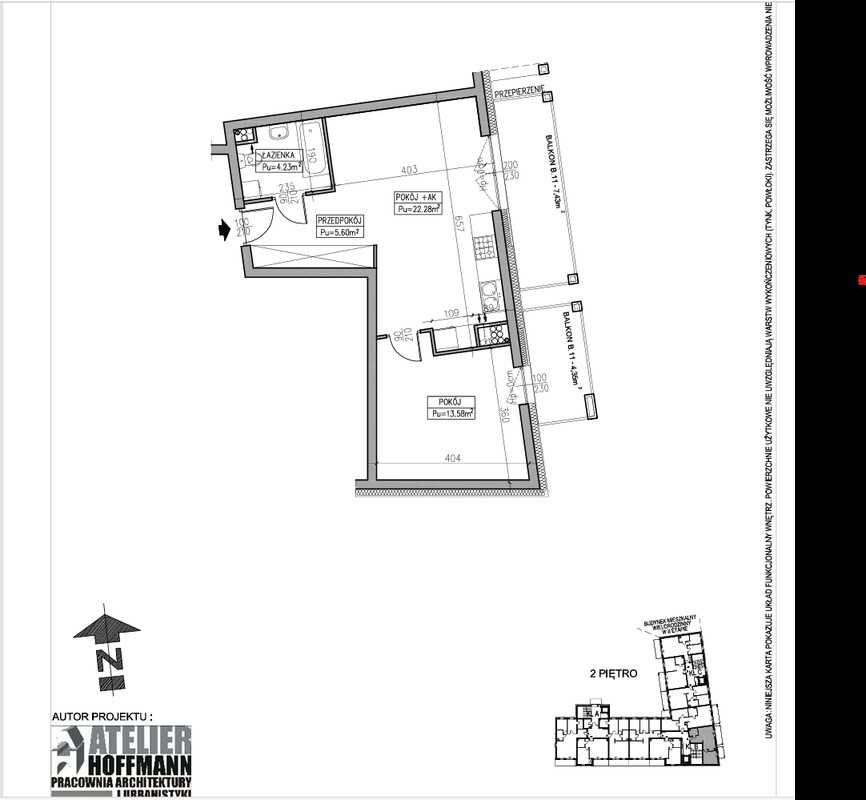 - Nowoczesny układ – przestronny, jasny salon z wyjściem na duży balkon, aneks kuchenny z wyposażeniem, sypialnia (mniejszy pokój) z wyjściem na drugi balkon, nowoczesna łazienka z kabiną prysznicową, przedpokój z zabudowaną dużą szafą.