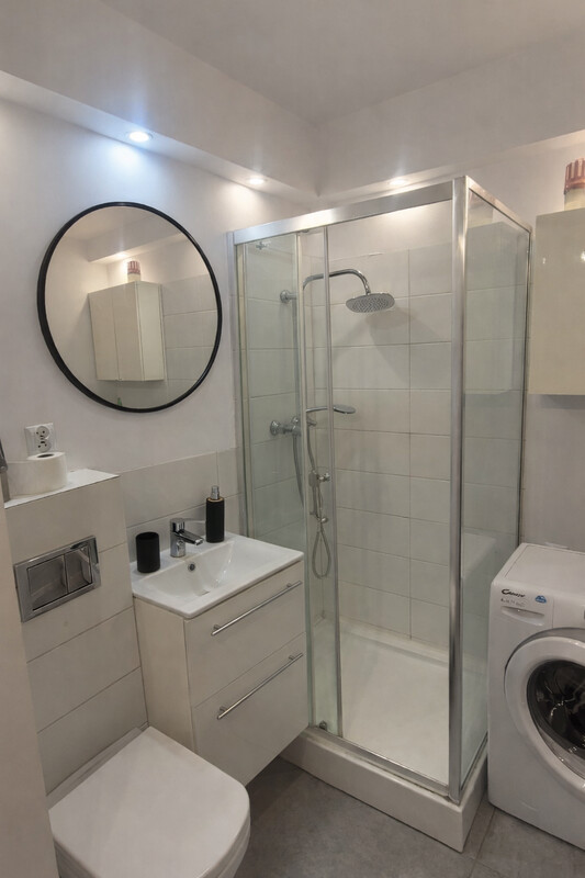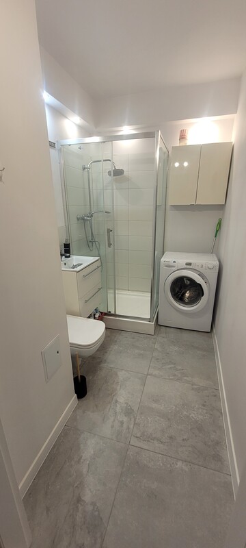 ✔️ łazienka z prysznicem, WC, lustrem, dwiema szafkami i pralką