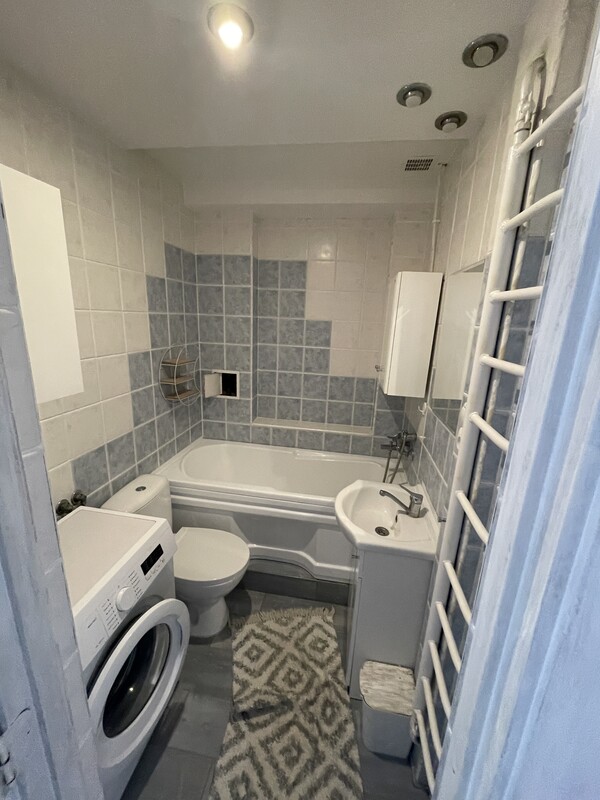 Na wyposażeniu znajdują się m.in. lodówka, kuchenka, zlew, pralka, wanna z prysznicem, rogówka, stół i krzesła.