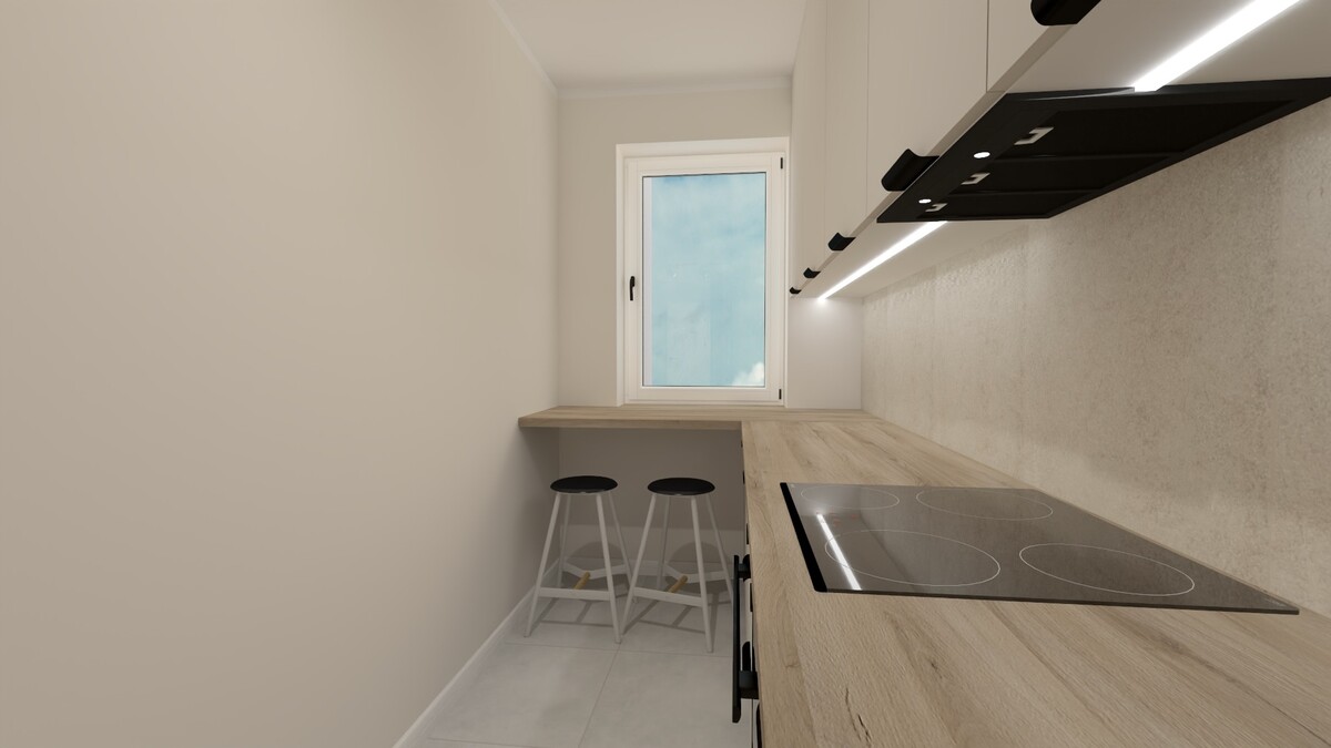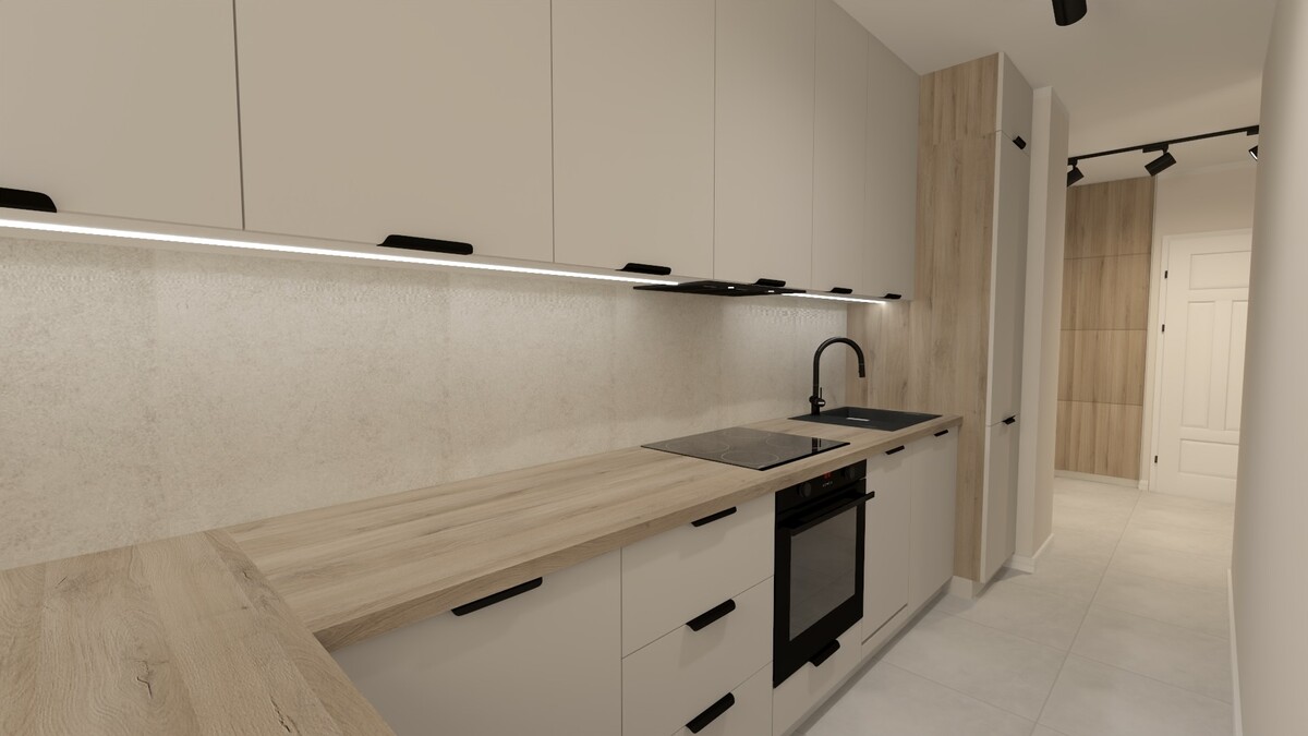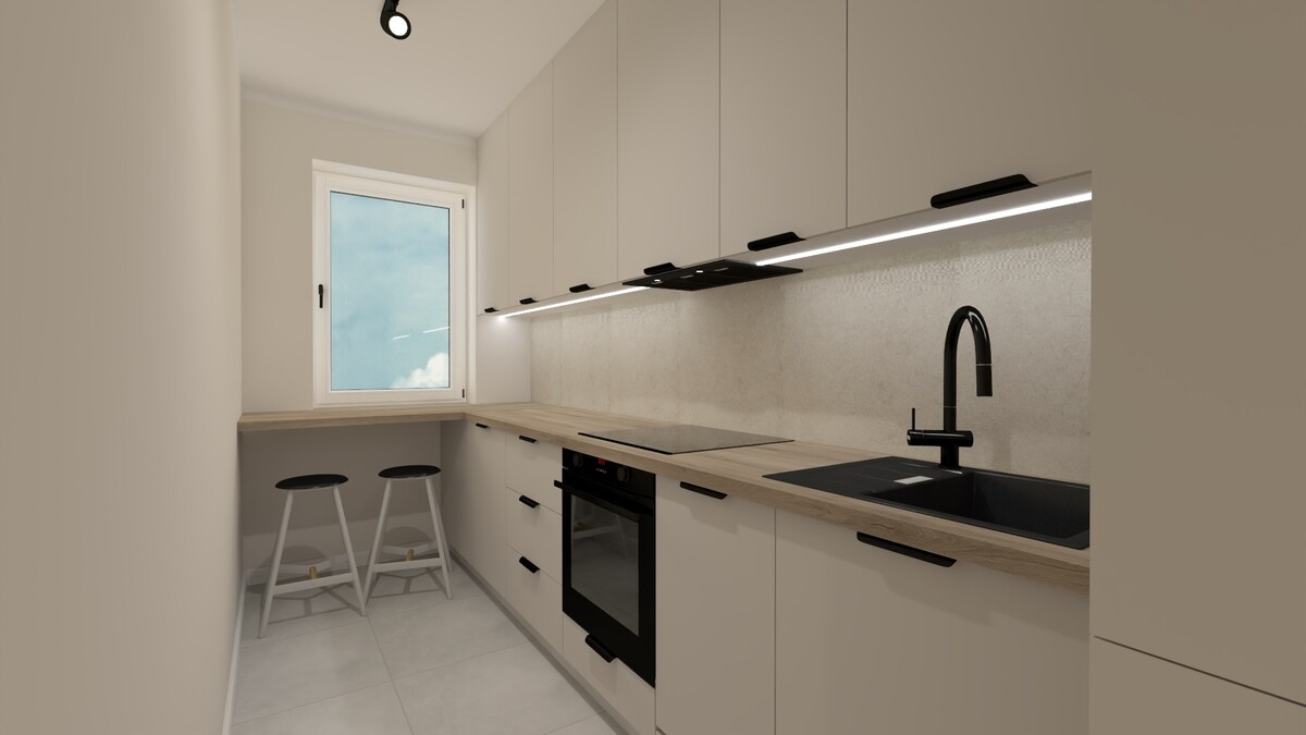 · osobna, jasna kuchnia z dużym oknem, gdzie wykonano meble na wymiar przez stolarza, (bez sprzętów AGD),