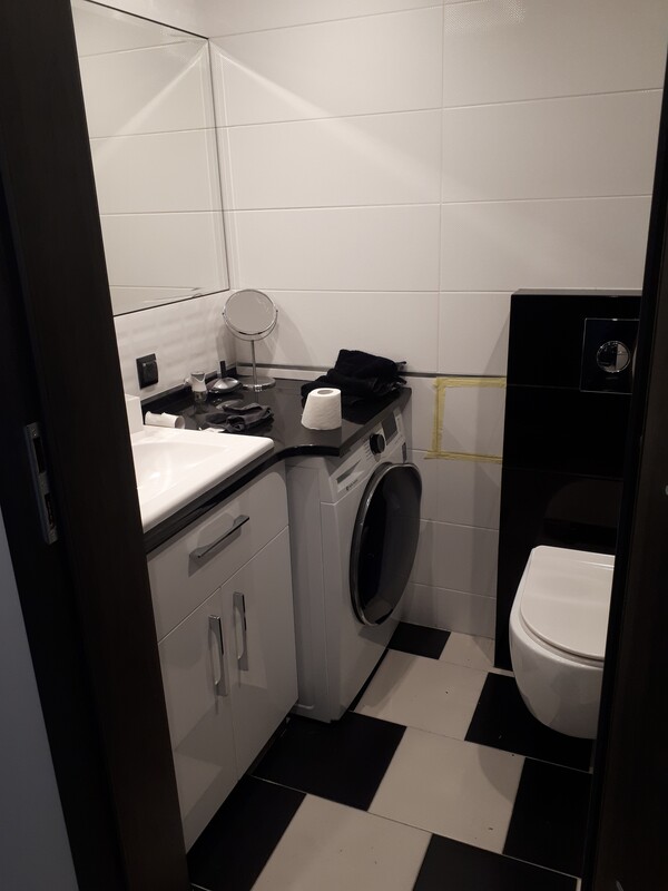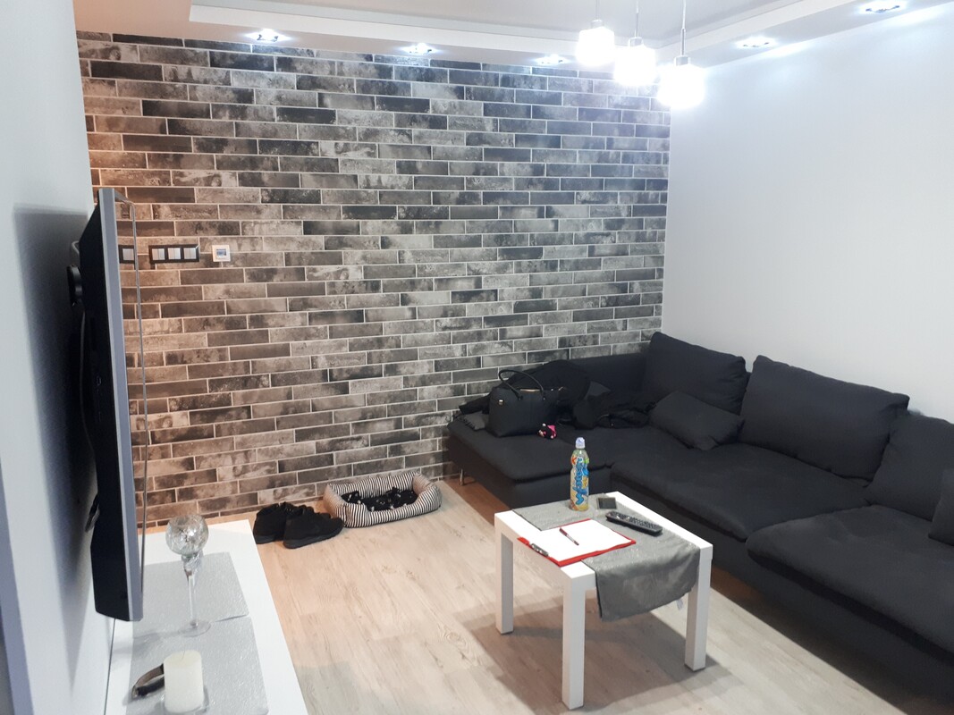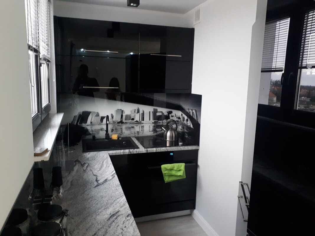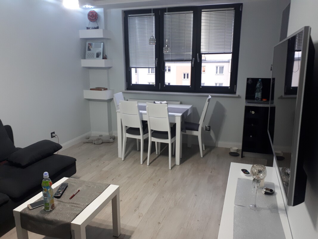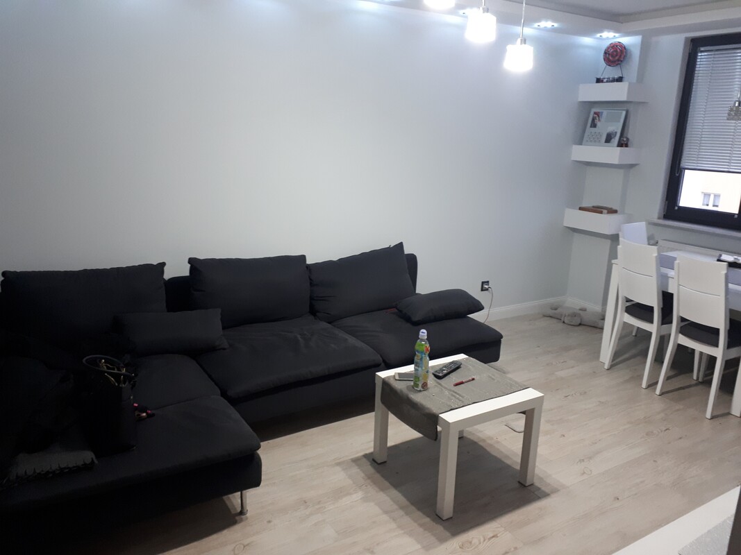 Lokal został wykończony z dbałością o wysoką jakość materiałów. Pokoje i kuchnia zostały wyłożone drewnopodobnymi płytkami podłogowymi, dodatkowo w salonie oraz łazience jest położone częściowe ogrzewanie podłogowe. Kuchnia była wykonywana na wymiar z zastosowaniem granitowych blatów oraz wyposażona jest w niezɓędne sprzęty AGD (piekarnik, lodówka, płyta indukcyjna) Łazienka wyposażona jest dodatkowo w pralko-suszarkę. Lokal posiada jasne pokoje z dużymi dźwiękoszczelnymi oknami oraz nowoczesnym wykończeniem. Mieszkanie jest w pełni umeblowane: w salonie znajduje się duża wygodna kanapa, szafka Rtv oraz rozkładany stół z krzesłami. W sypialni znajdziemy pojemną szafę z lustrami oraz komfortowe łóżko, w przedpokoju szafka na buty z granitowym blatem.