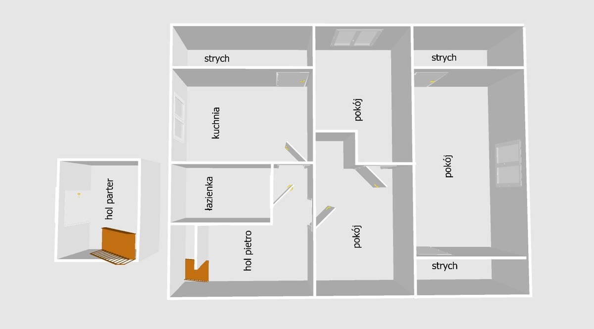 • na pierwszym piętrze: trzy pokoje, kuchnia, łazienka oraz przedpokój.