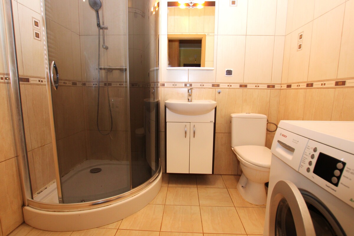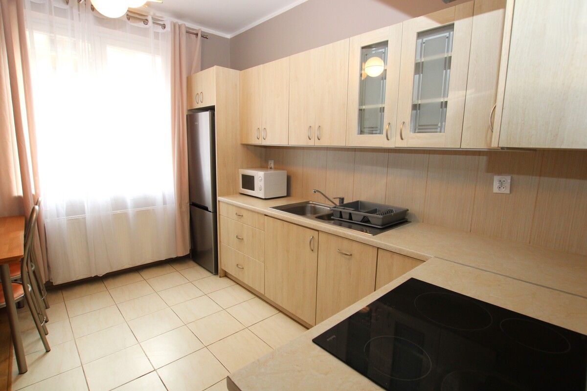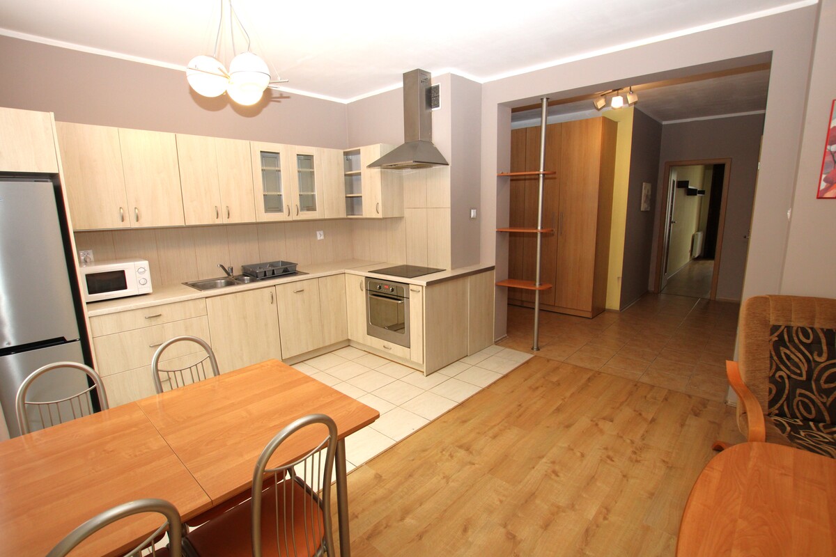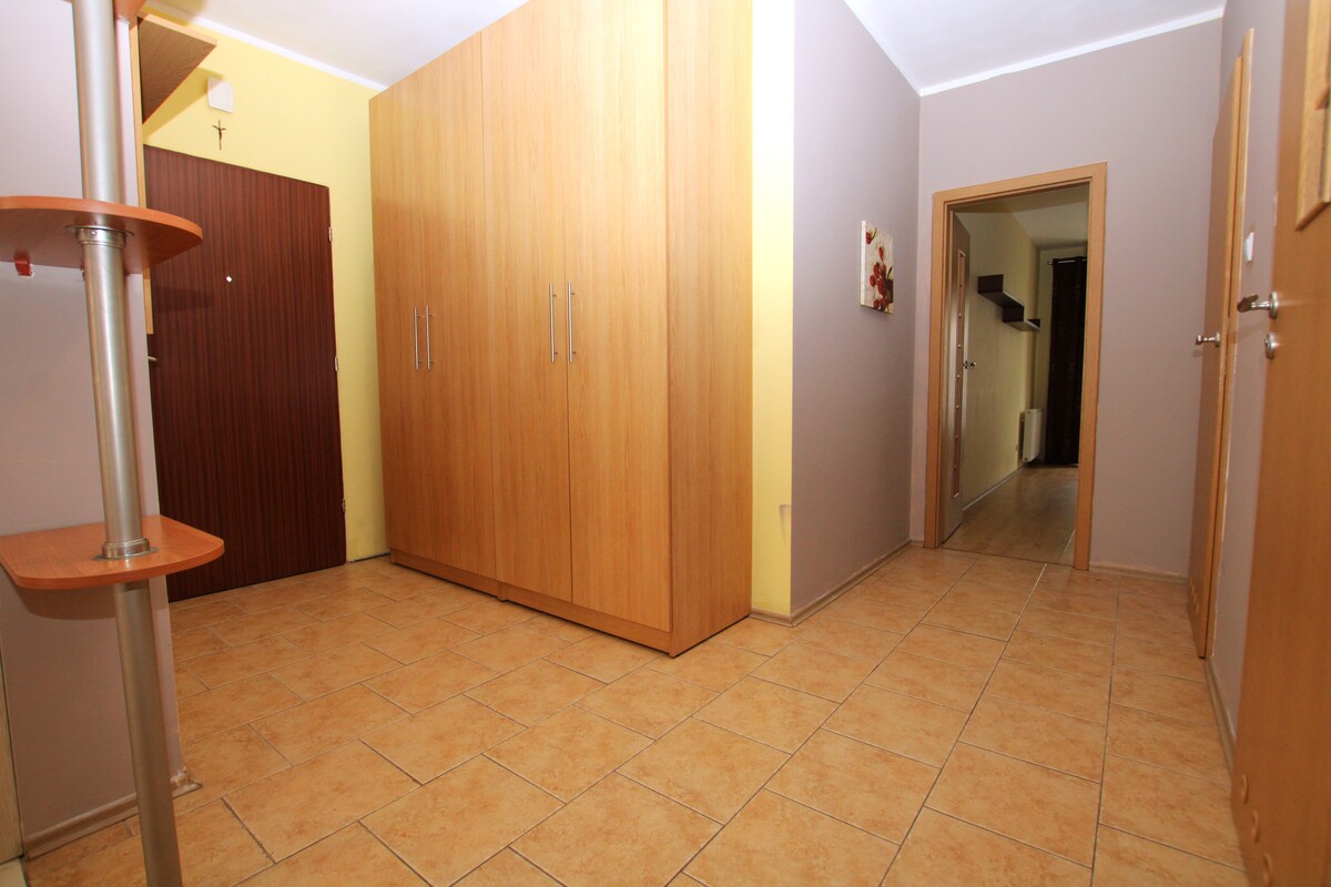 Mieszkanie 2-pokojowe o powierzchni 56 m2, składające się z otwartego pokoju dziennego z aneksem kuchennym, z dużym balkonem, odrębnej wygodnej sypialni, łazienki z wc, przedpokoju oraz schowka gospodarczego. Lokal umeblowany oraz wyposażony w niezbędne sprzęty AGD tj. lodówka, pralka, zmywarka. Łazienka z kabiną prysznicową pokryta glazurą i terakotą, obszerna szafa garderobiana w przedpokoju. Usytuowane w kamienicy z nowszych zasobów, położone na I piętrze. Oferta skierowana do osób pracujących, bez zwierząt.