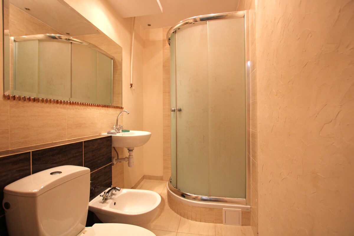 Łazienka z kabiną prysznicową, pokryta zadbaną glazurą i terakotą. Stolarka okienna PCV - starszego typu. Przedpokój zabudowany szafą wnękową.