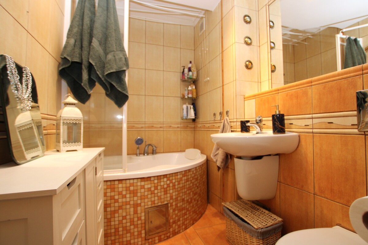 Zadbana łazienka - wykończona estetyczną glazurą i terakotą, wyposażona w narożną wannę z praktyczną szybą prysznicową.