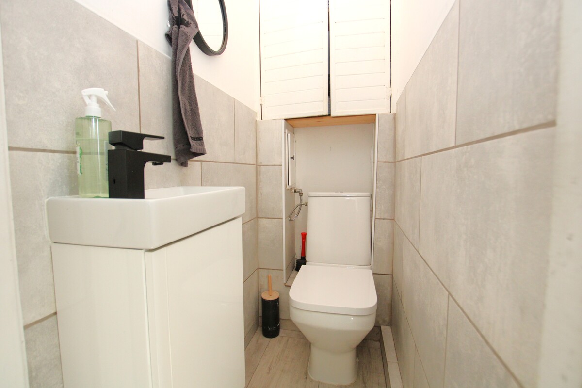 Jasne wnętrza: podłogi wykończone zostały jasnymi panelami, okna PCV oraz drewniane okna dachowe typu Velux gwarantują doskonałe doświetlenie. Odrębna toaleta wykończona została estetyczną glazurą i terakotą. Łazienka z oknem, czeka na Twój pomysł na remont.