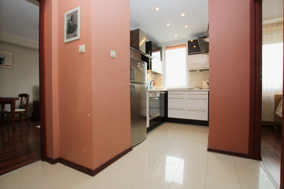 Wnętrze wyróżnia się niezwykle przemyślanym układem – osobne wejścia do każdego z pomieszczeń gwarantują prywatność i wygodę codziennego życia. Sercem mieszkania jest jasny pokój dzienny z bezpośrednim wyjściem na balkon. Uzupełnieniem przestrzeni jest funkcjonalna łazienka wyposażona w wannę narożną, wykończona ponadczasową glazurą i terakotą, która zachowa swój styl przez lata. Na podłogach w pokojach położono estetyczne panele, a w części przedpokojowej i kuchennej elegancki gres. Stolarka okienna PCV. Przedpokój zabudowany szafą garderobianą.