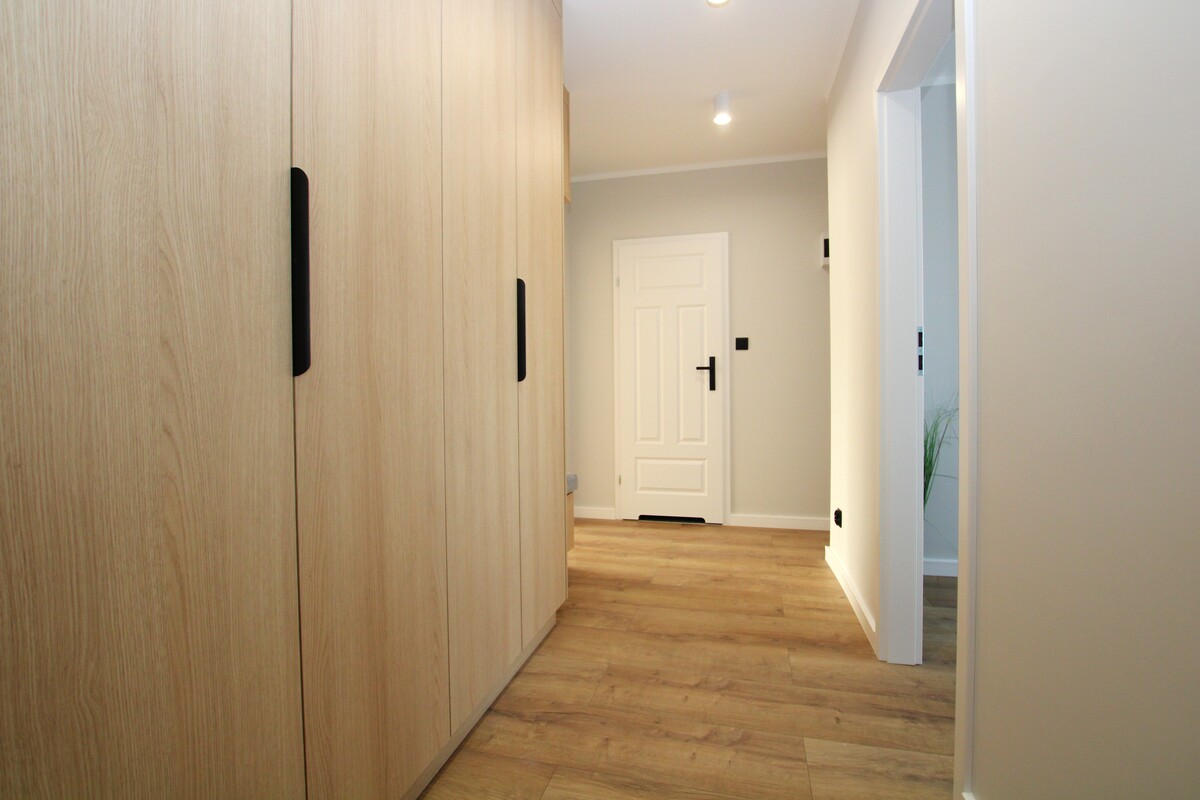 Jasne, naturalne panele na podłogach, nowoczesna glazura i terakota w łazience oraz przemyślane oświetlenie tworzą spójną i przytulną atmosferę. Mieszkanie to synonim dobrego smaku.