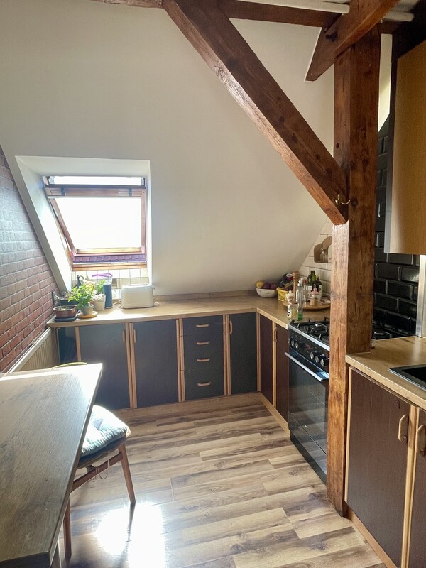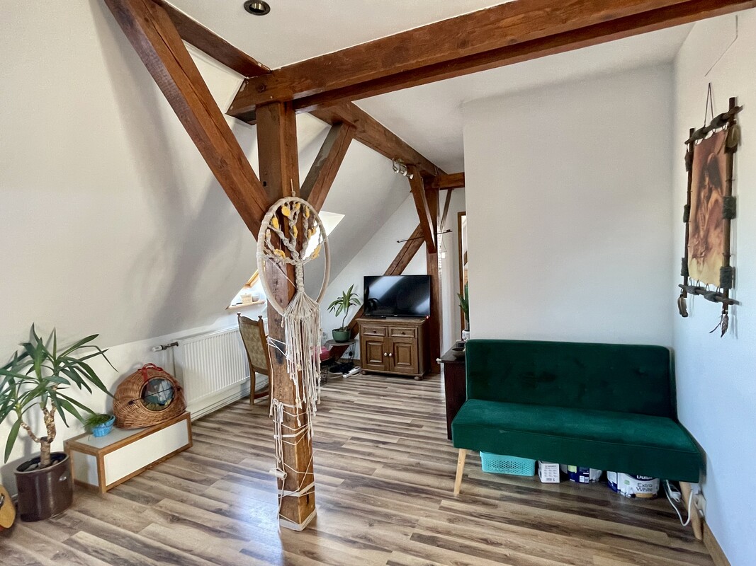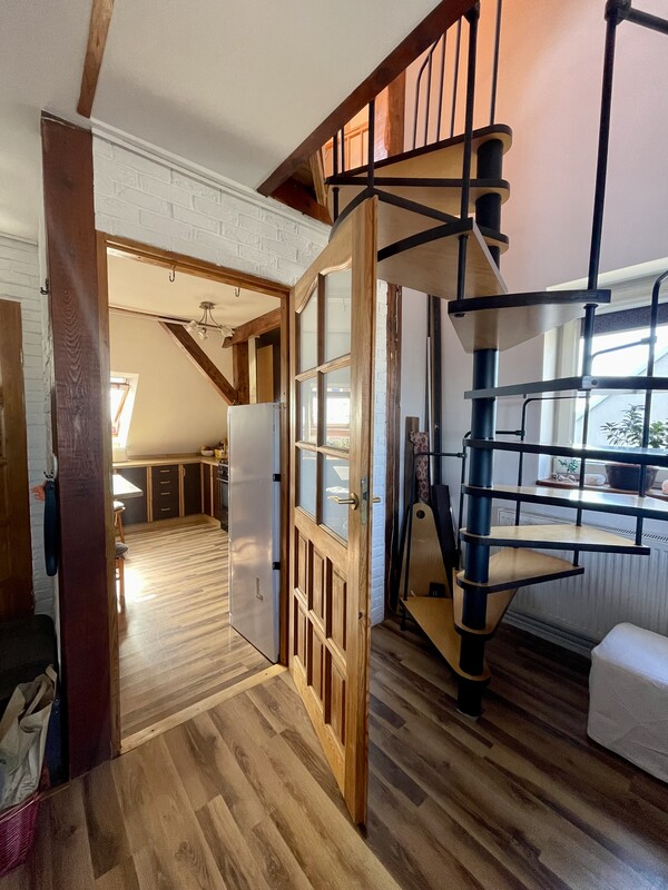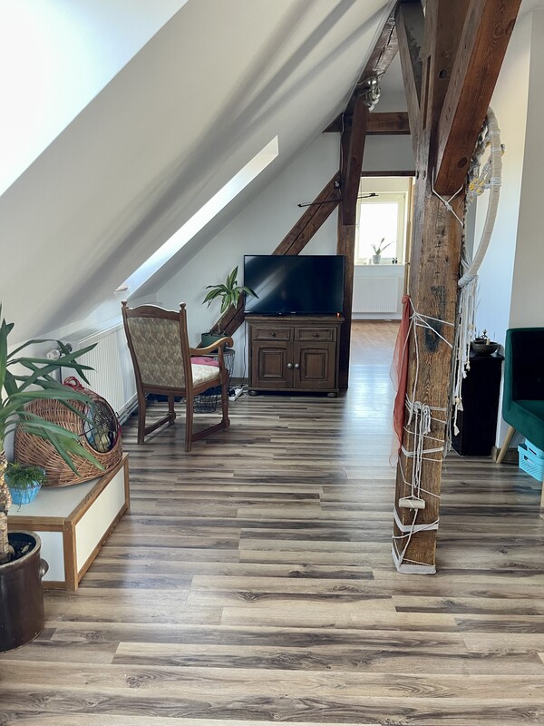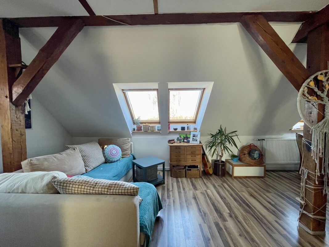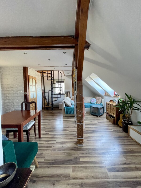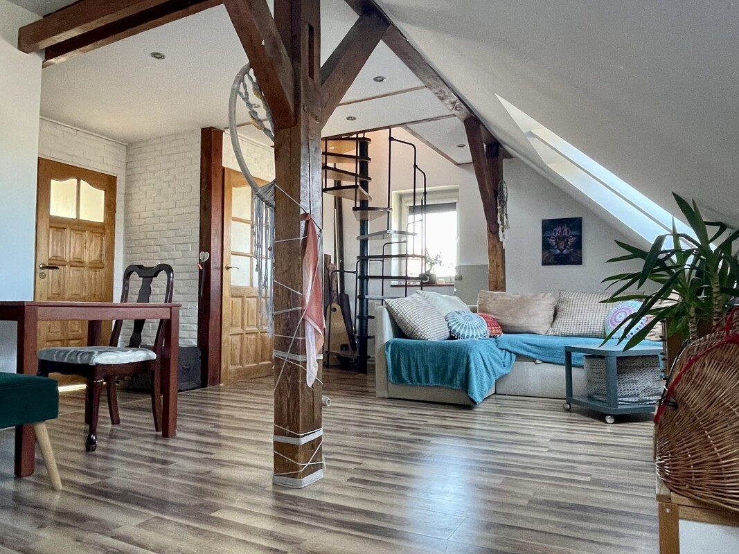 Atutem nieruchomości jest przestronna, otwarta strefa dzienna, jasne wnętrza, funkcjonalnie wykorzystane skosy oraz niepowtarzalny charakter, którego trudno szukać w standardowych mieszkaniach. Drewniane elementy konstrukcyjne, okna połaciowe i ciepłe wykończenie tworzą przytulną, bardzo klimatyczną przestrzeń do życia.