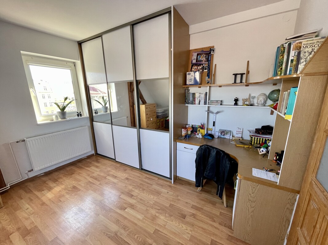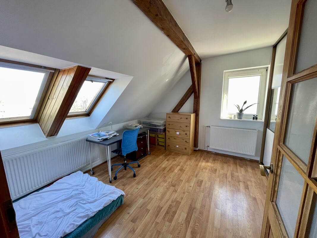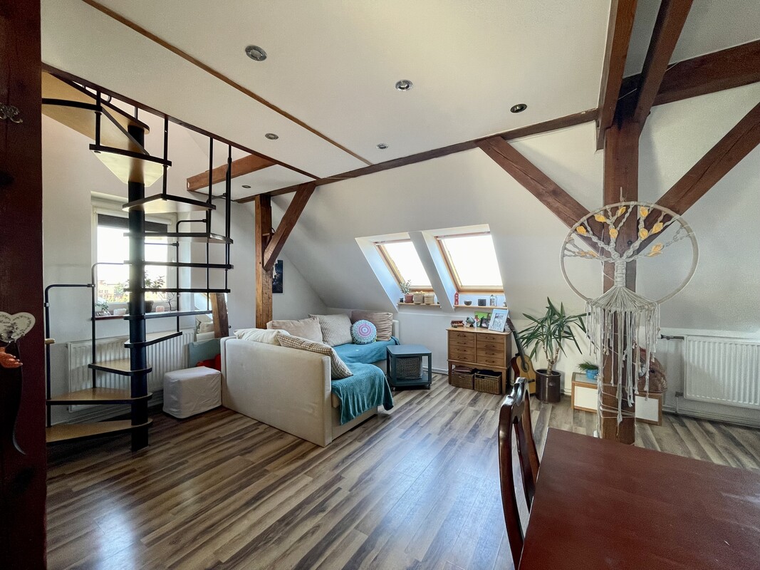 Dwupoziomowe mieszkanie z wyjątkowym klimatem, położone na poddaszu, z pięknie wyeksponowanymi drewnianymi belkami. Duża ilość naturalnego światła zapewniana jest przez okna wychodzące na wszystkie cztery strony. Lokal o powierzchni użytkowej 42,1m² oferuje jednocześnie blisko 70 m² powierzchni po podłodze, dzięki czemu daje znacznie większe poczucie przestrzeni niż wynikałoby to z samego metrażu.