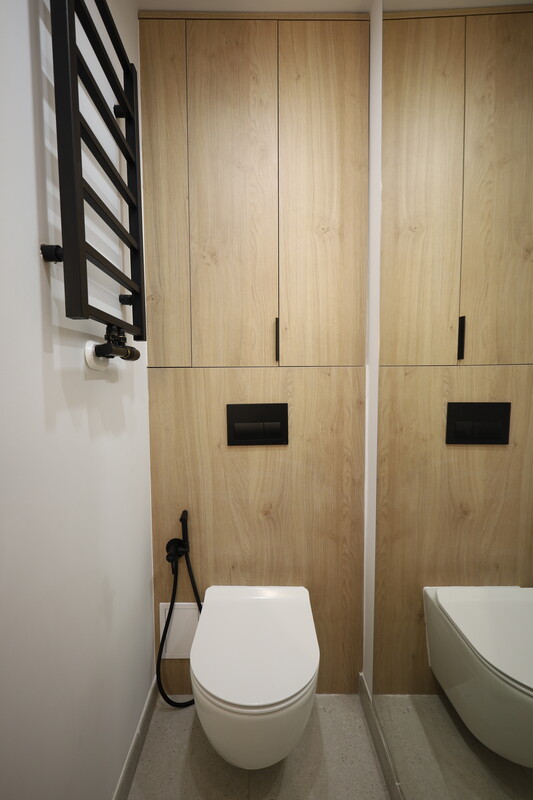 geberit z misą bezkołnierzową, baterią bidetką i szafką na wymiar,