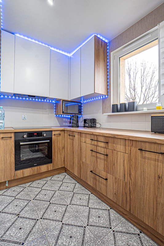 oddzielna, widna kuchnia – po remoncie, wyposażona w zabudowę,