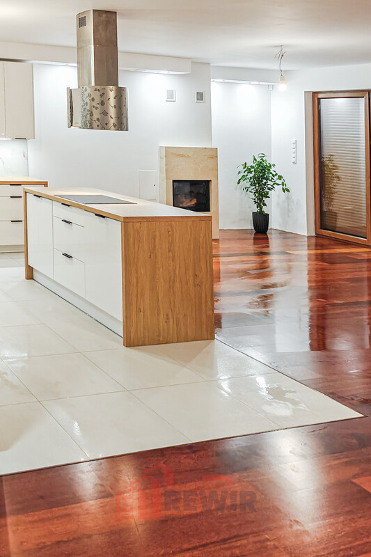 - Przestronny salon z aneksem kuchennym w którym znajduje się wyspa kuchenna