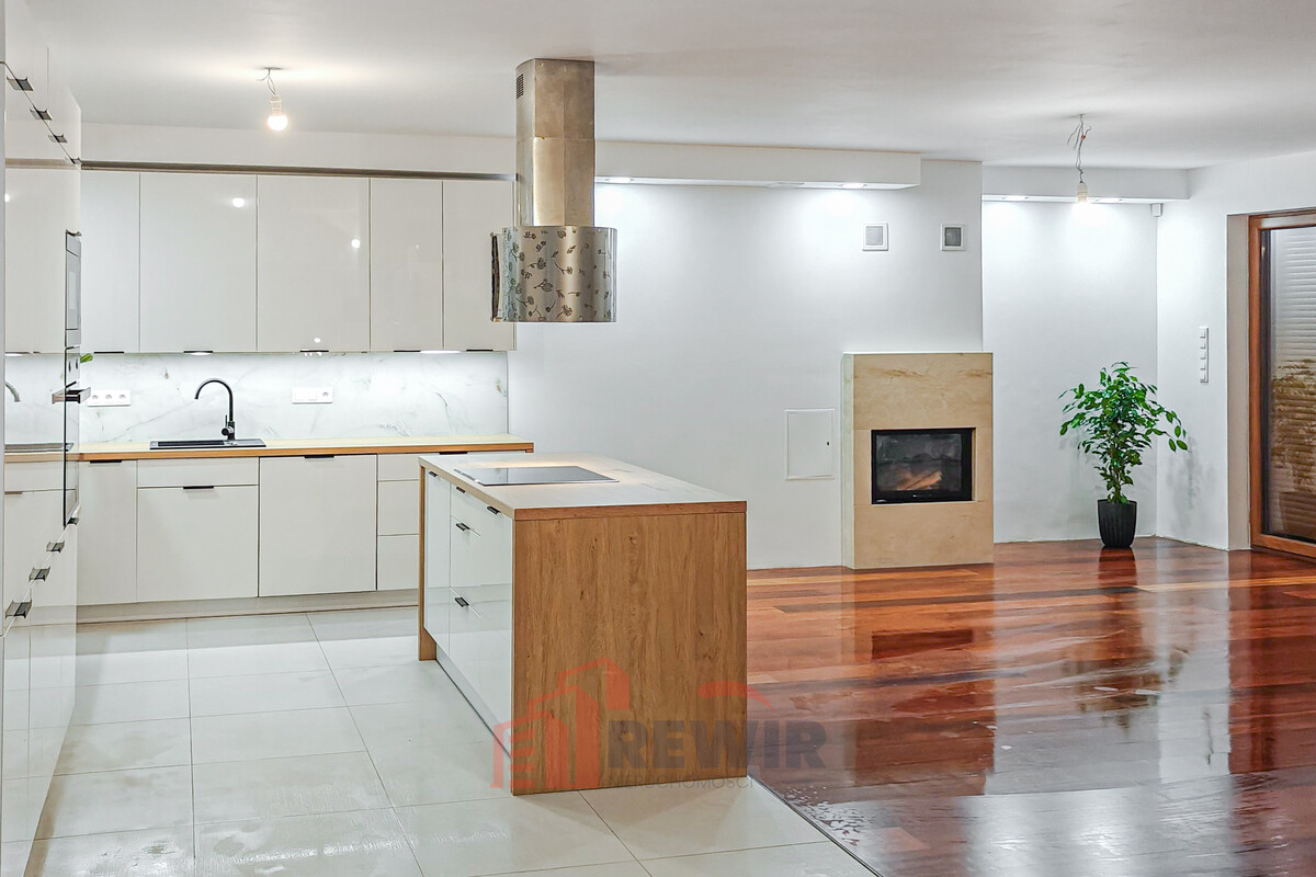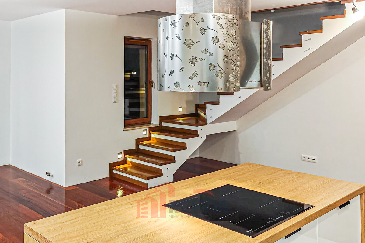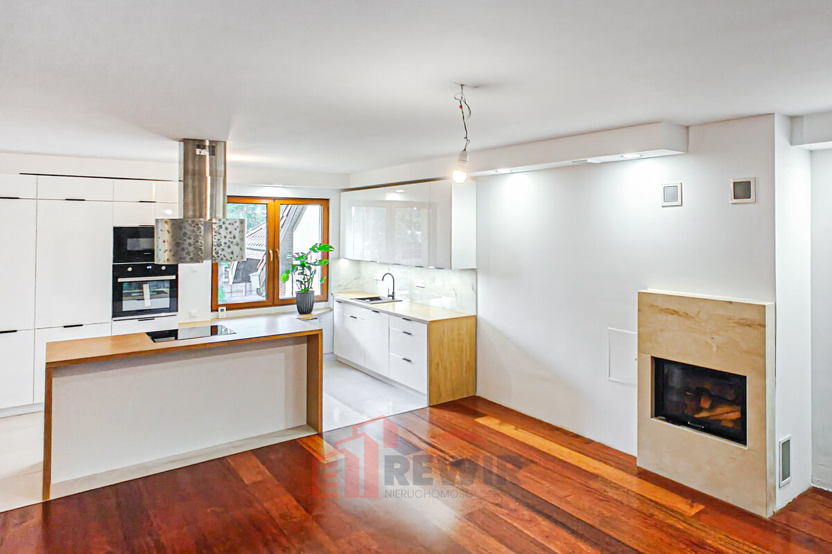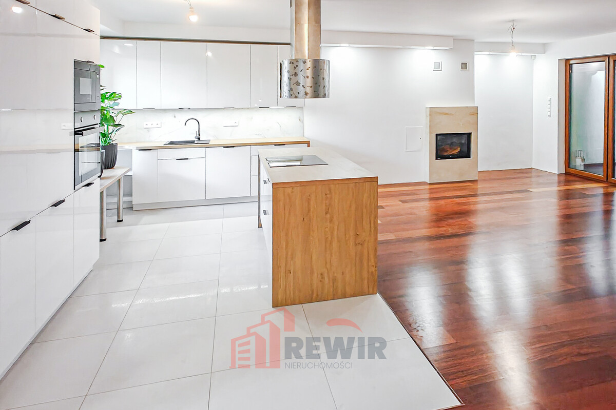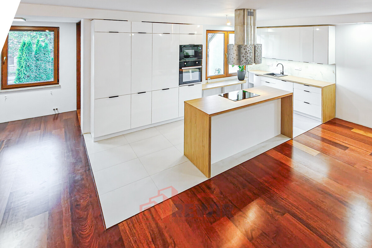 Kuchnia została wyposażona w wysokiej jakości zabudowę stolarską oraz nowoczesny sprzęt AGD. Wyspa kuchenna stanowi centralny punkt kuchni, zapewniając dodatkowe miejsce do gotowania i spożywania posiłków, a jednocześnie pełni funkcję stylowego elementu wykończenia.