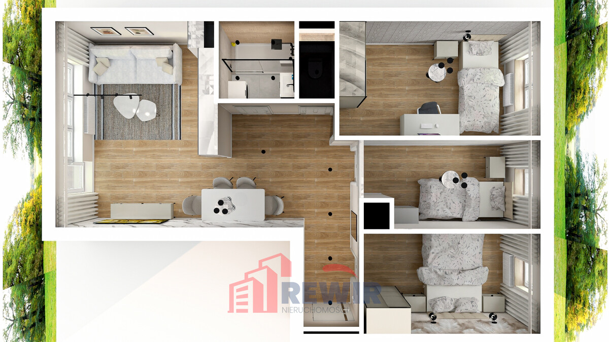 Łączna powierzchnia nieruchomości wynosi 59,50 m2,na które składają się: salon z aneksem kuchennym i wyjściem na balkon, 3 sypialnie, łazienka z dużą kabiną prysznicową, wc oraz przedpokój.