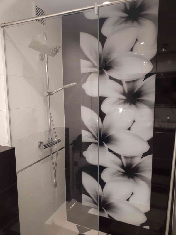 Nowoczesna łazienka z kabiną prysznicową (walk-in) i wc